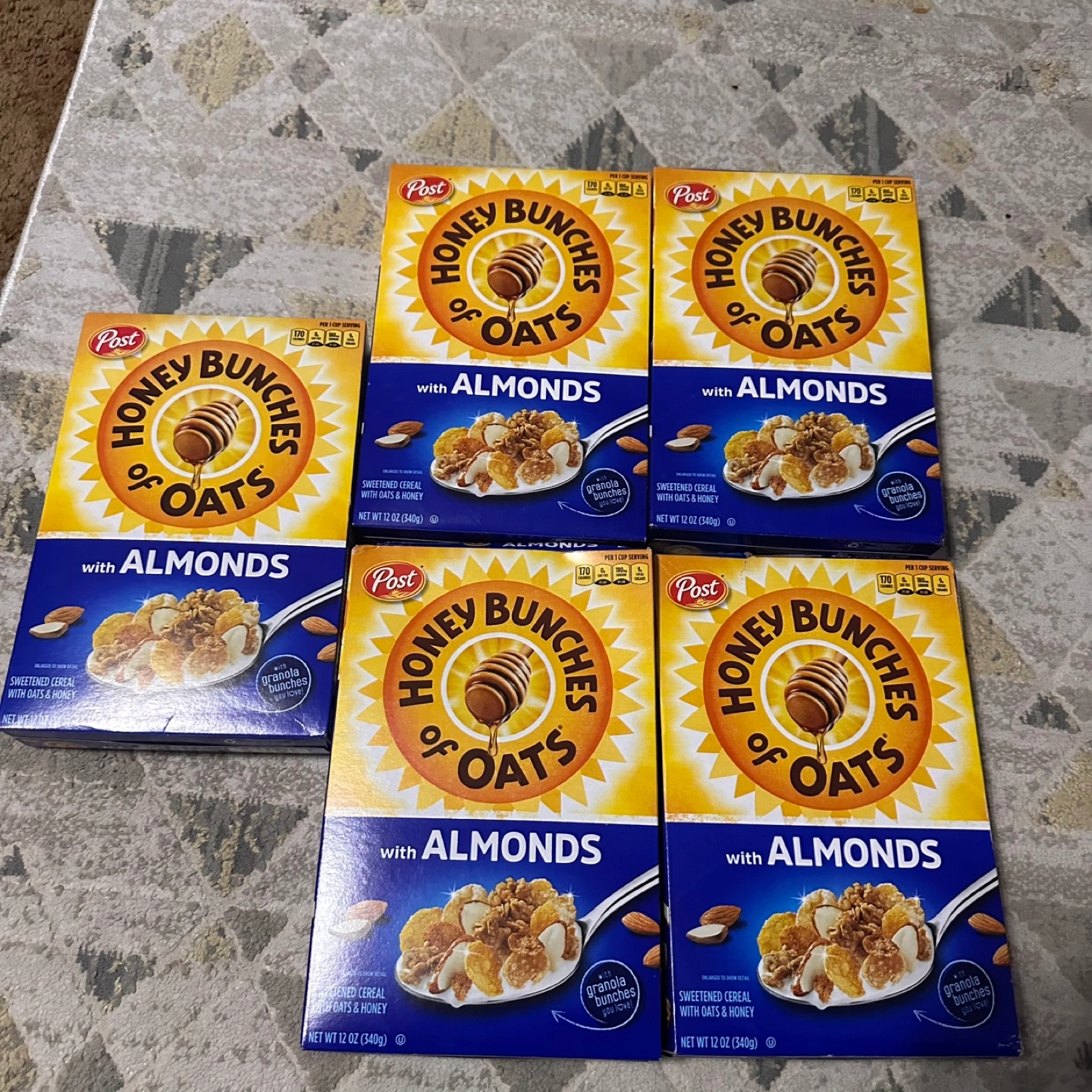 Bulk cereal sale. Six unopened boxes of Post Honey Bunches of Oats with Almonds cereal. Sweetened cereal with oats and honey. Expiration dates vary.