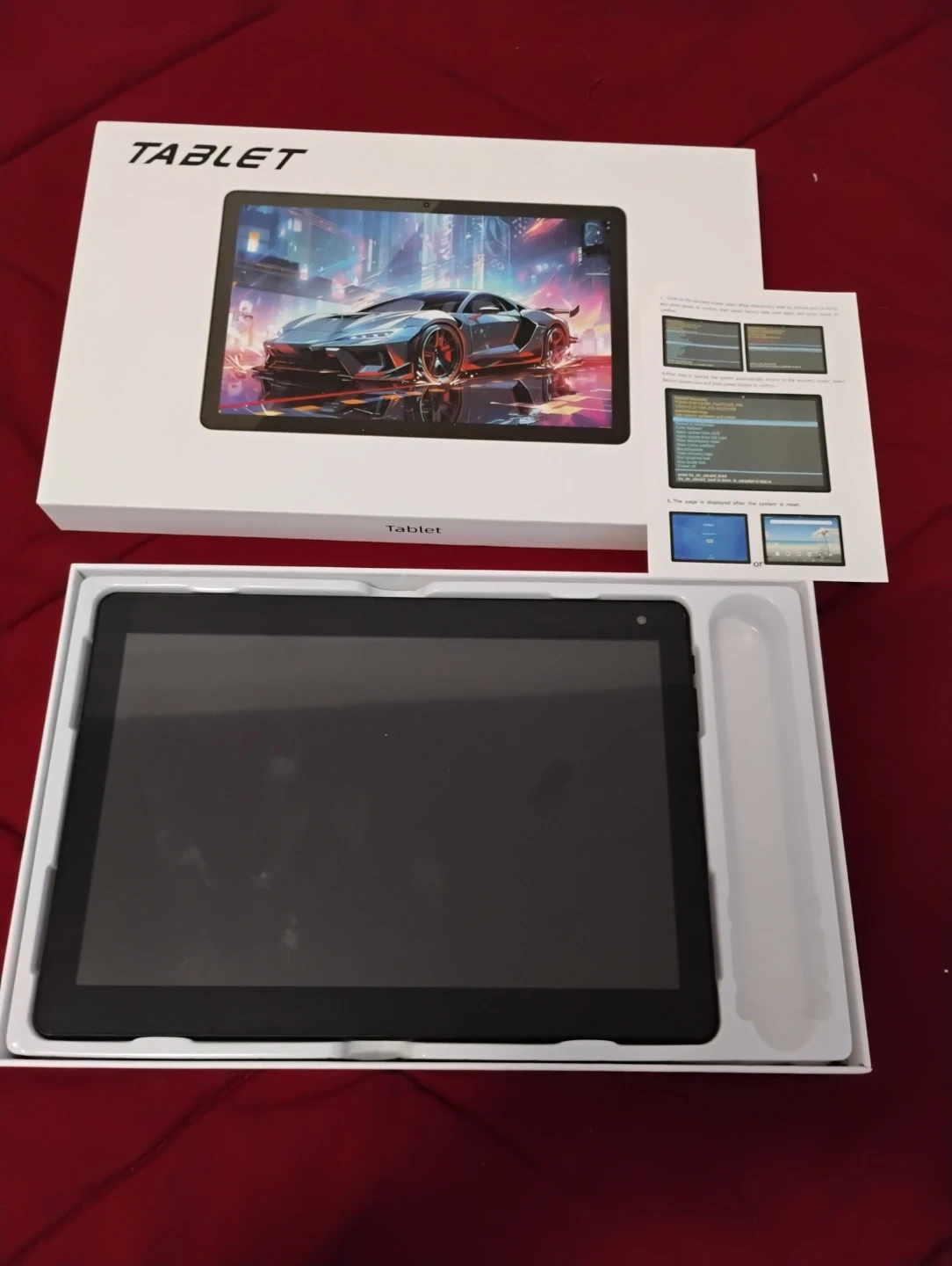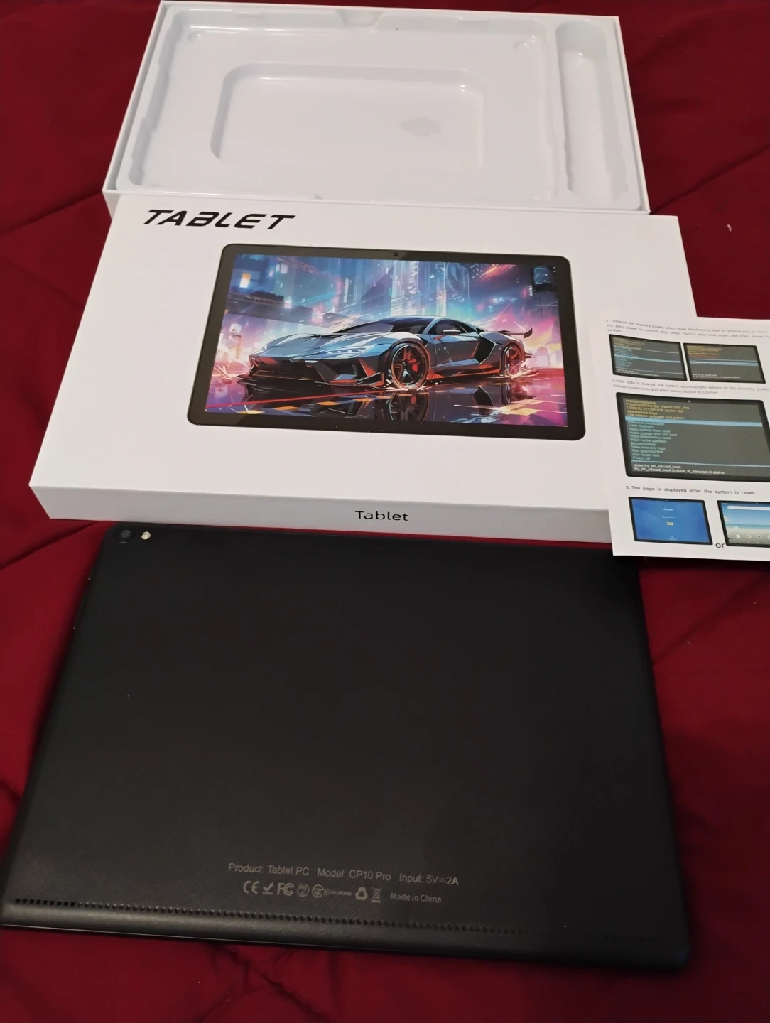 š„ tablet PC comes in its original box and packaging. It's a CP10 Pro model with an input of 5V=2A. The device is black and made in China. It includes a stylus for use with the screen. The tablet's screen displays vibrant graphics, and it comes with a user manual. This tablet is suitable for general use and entertainment.