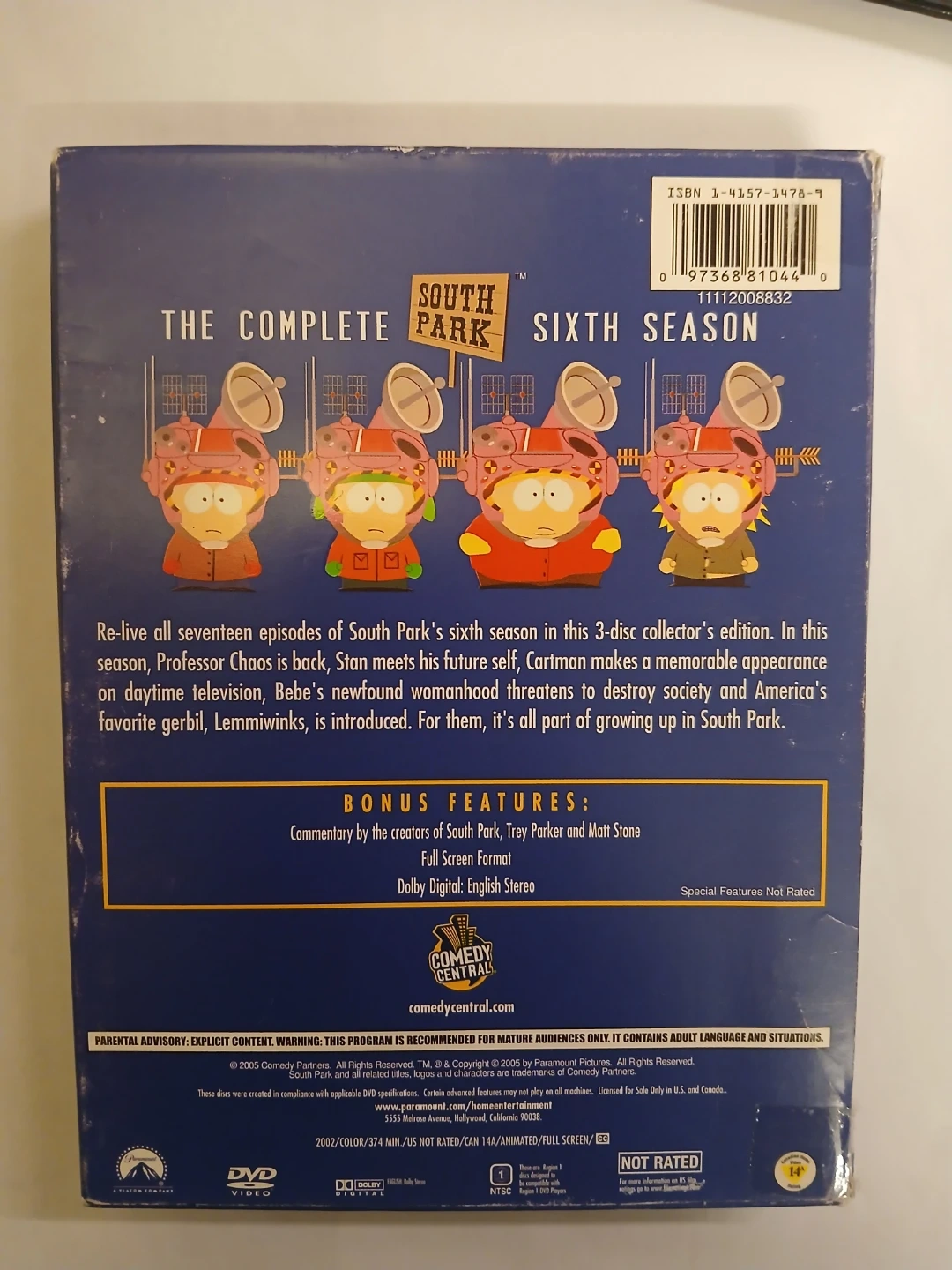 This is the complete sixth season of South Park on DVD. It includes all 17 episodes across 3 discs. Bonus features include commentary by the creators and original theatrical trailers. Full screen format.