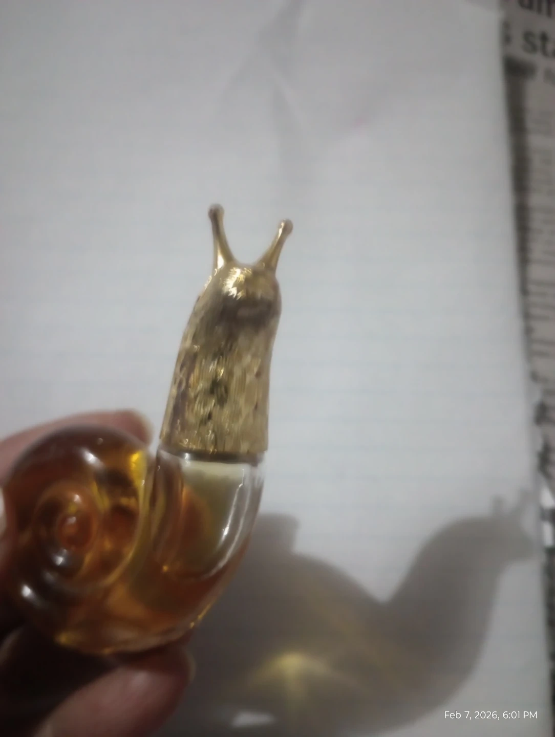 This is a unique perfume bottle shaped like a snail. It has a glass body with a gold-colored cap and detailing. The bottle is amber-colored.