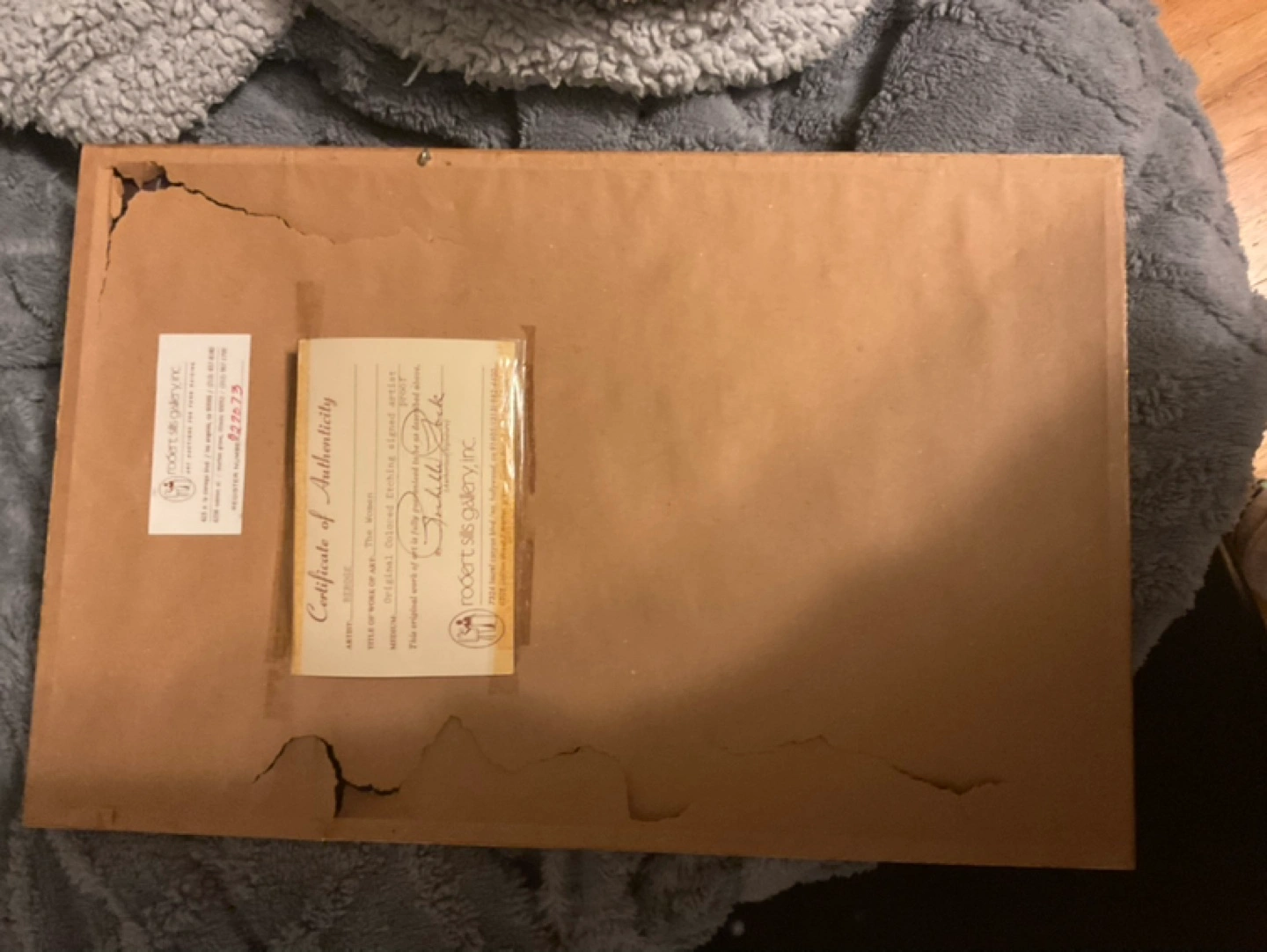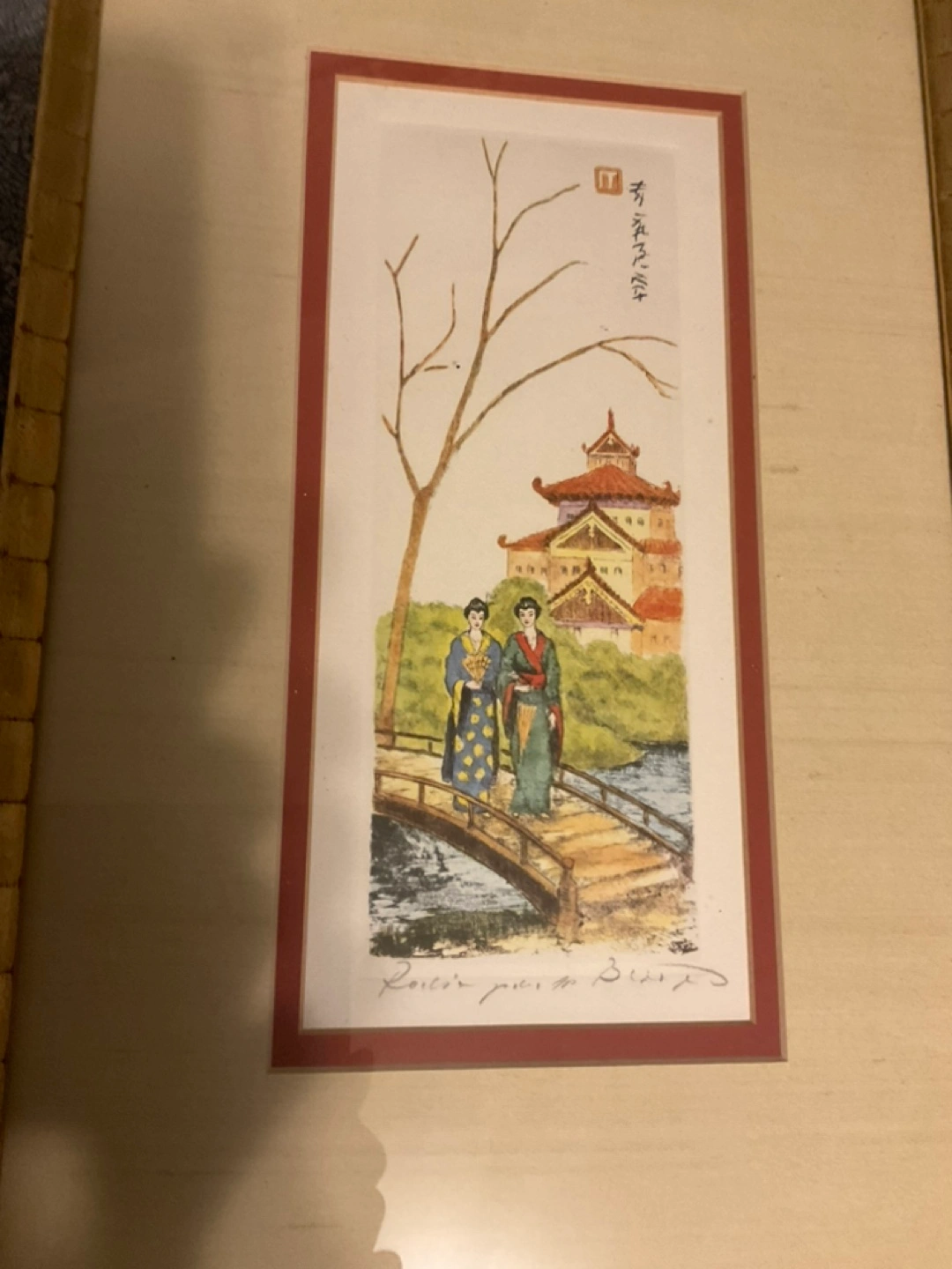 Framed art print. Features two women in kimonos walking across a bridge. Asian-inspired landscape. Comes with certificate of authenticity. Minor frame damage.