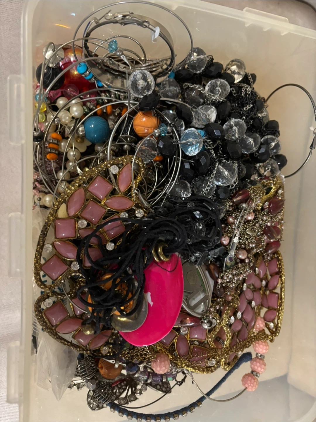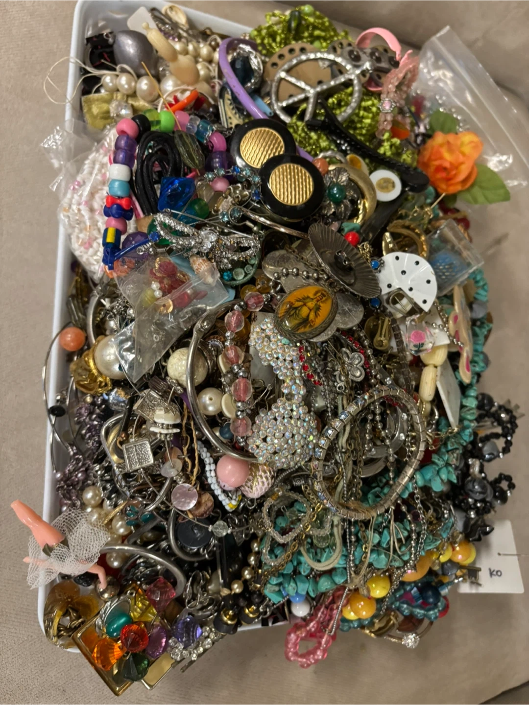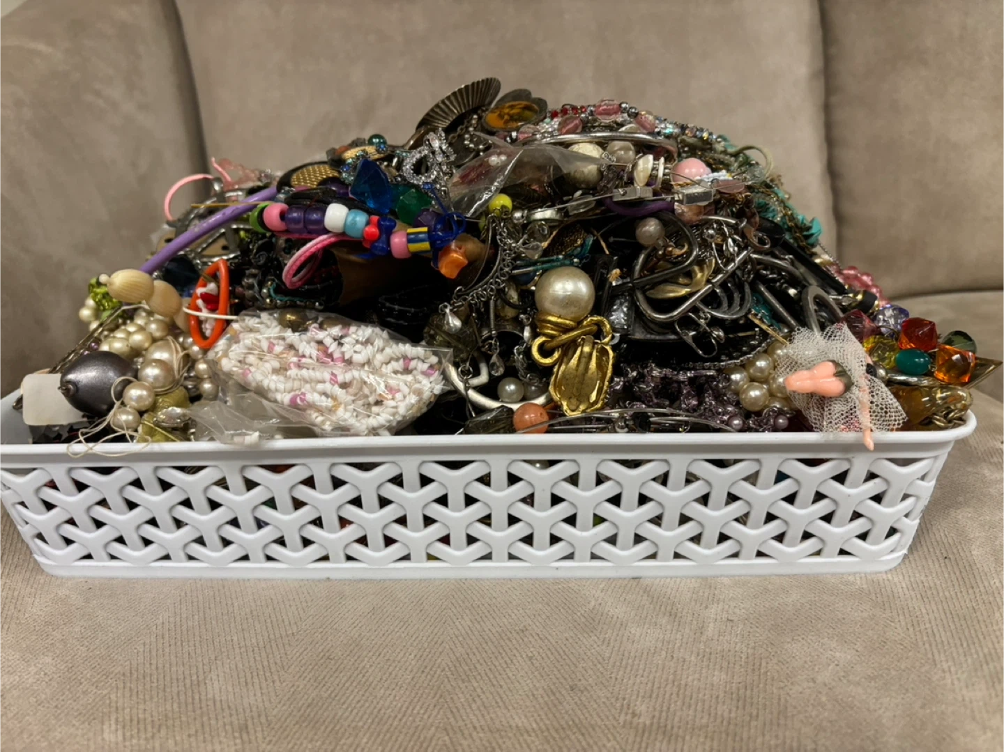Massive collection of assorted jewelry, weighing 15.6 lbs. Perfect for crafting projects, jewelry making, or repurposing. Includes a wide variety of beads, chains, pendants, and costume pieces. Great for DIY enthusiasts and crafters!