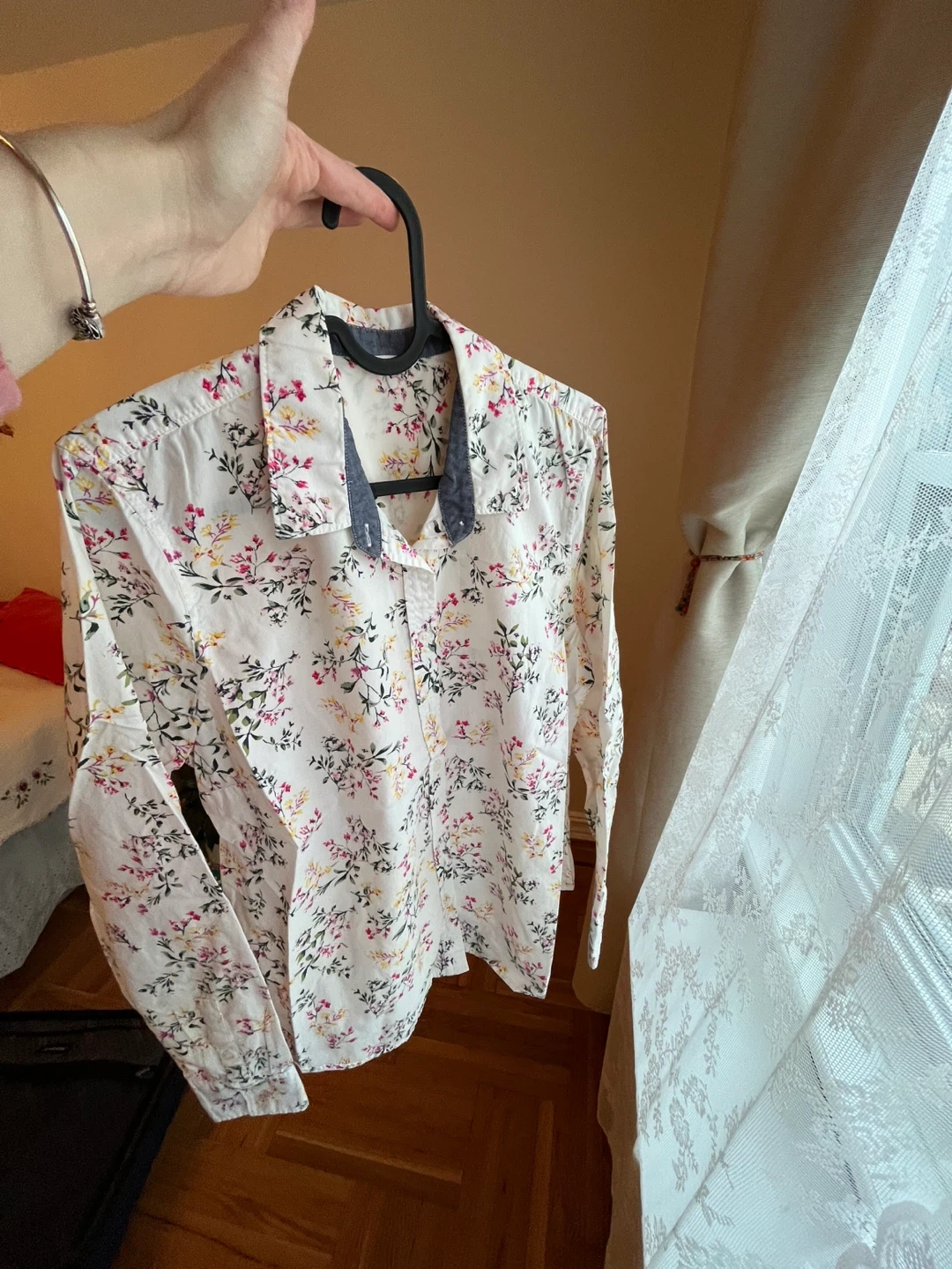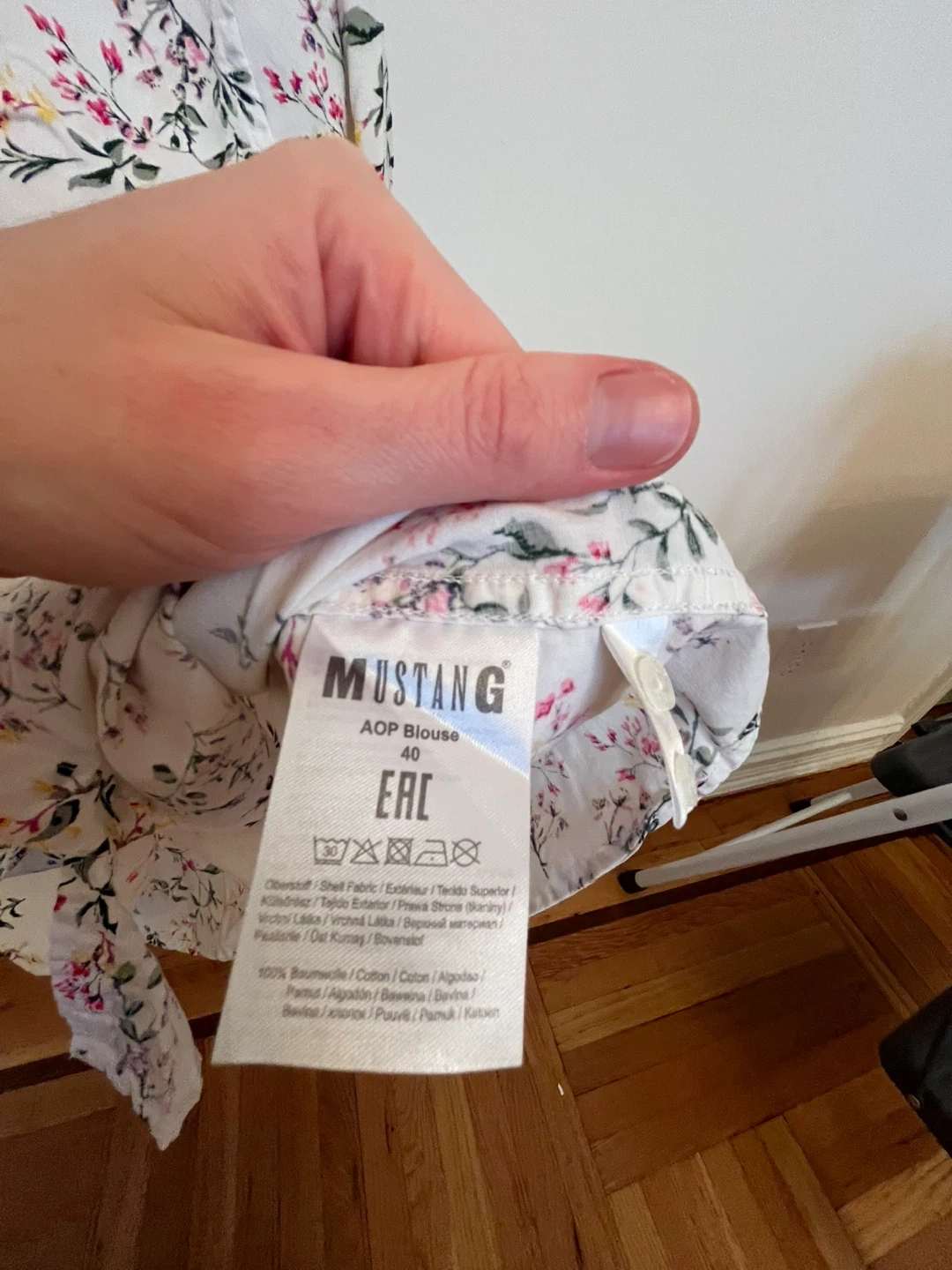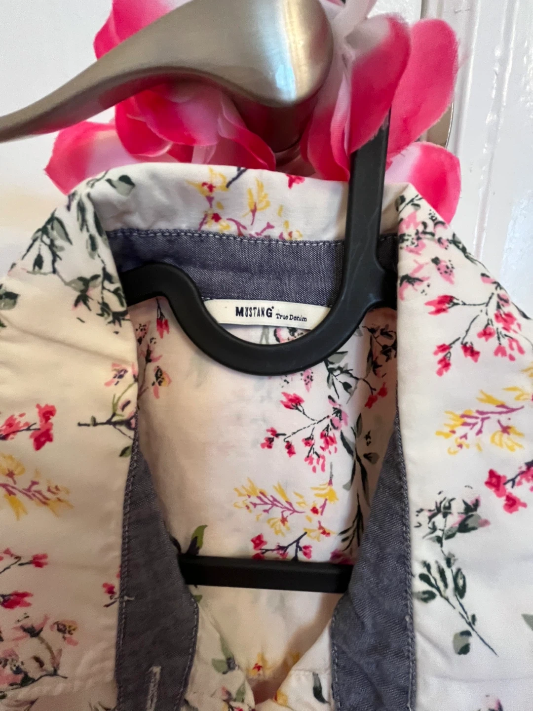 Selling a cute Mustang blouse with a floral print! It's a size 38 and made of 100% Baumwolle/Cotton/Coton/Algodon.