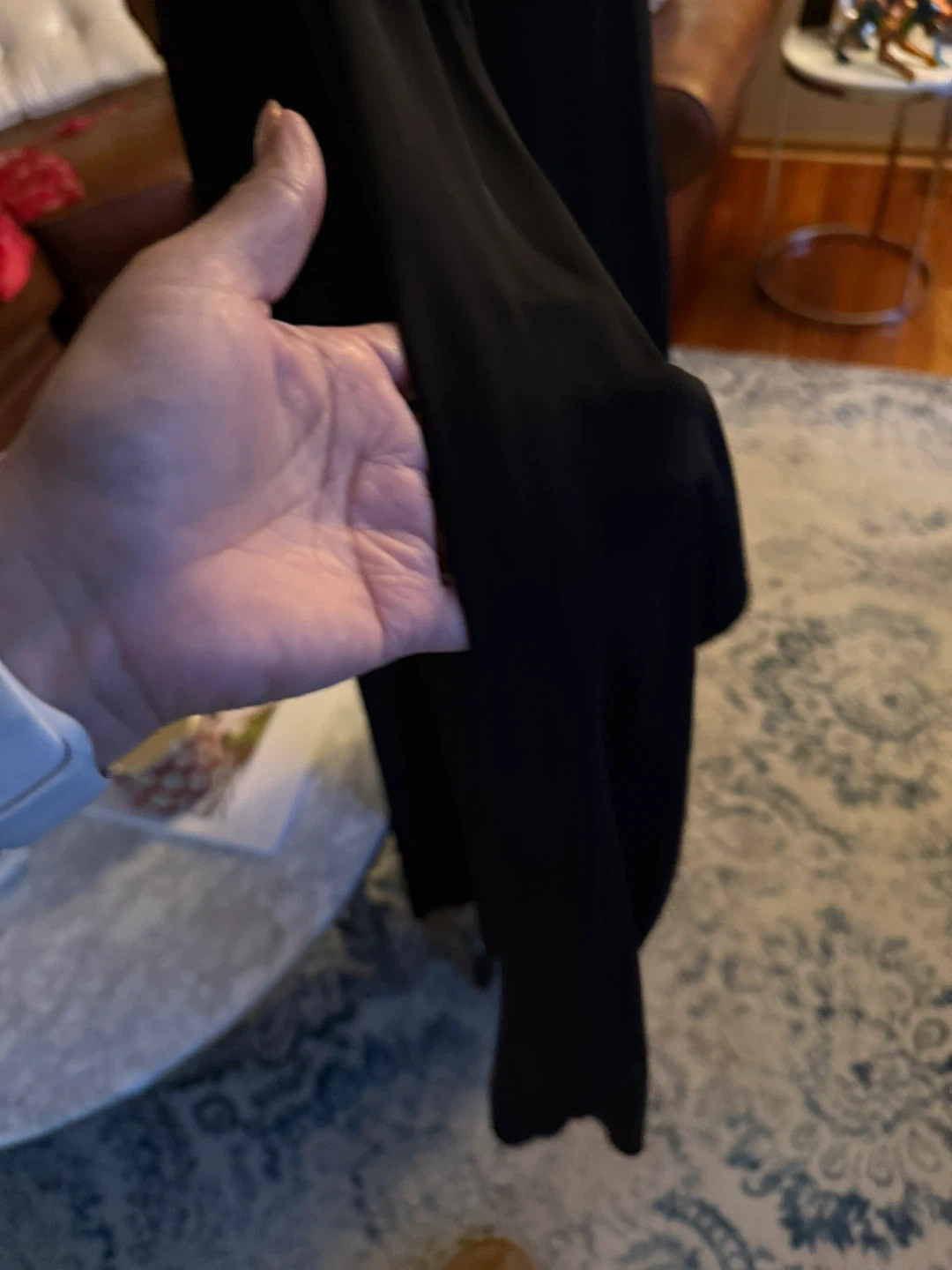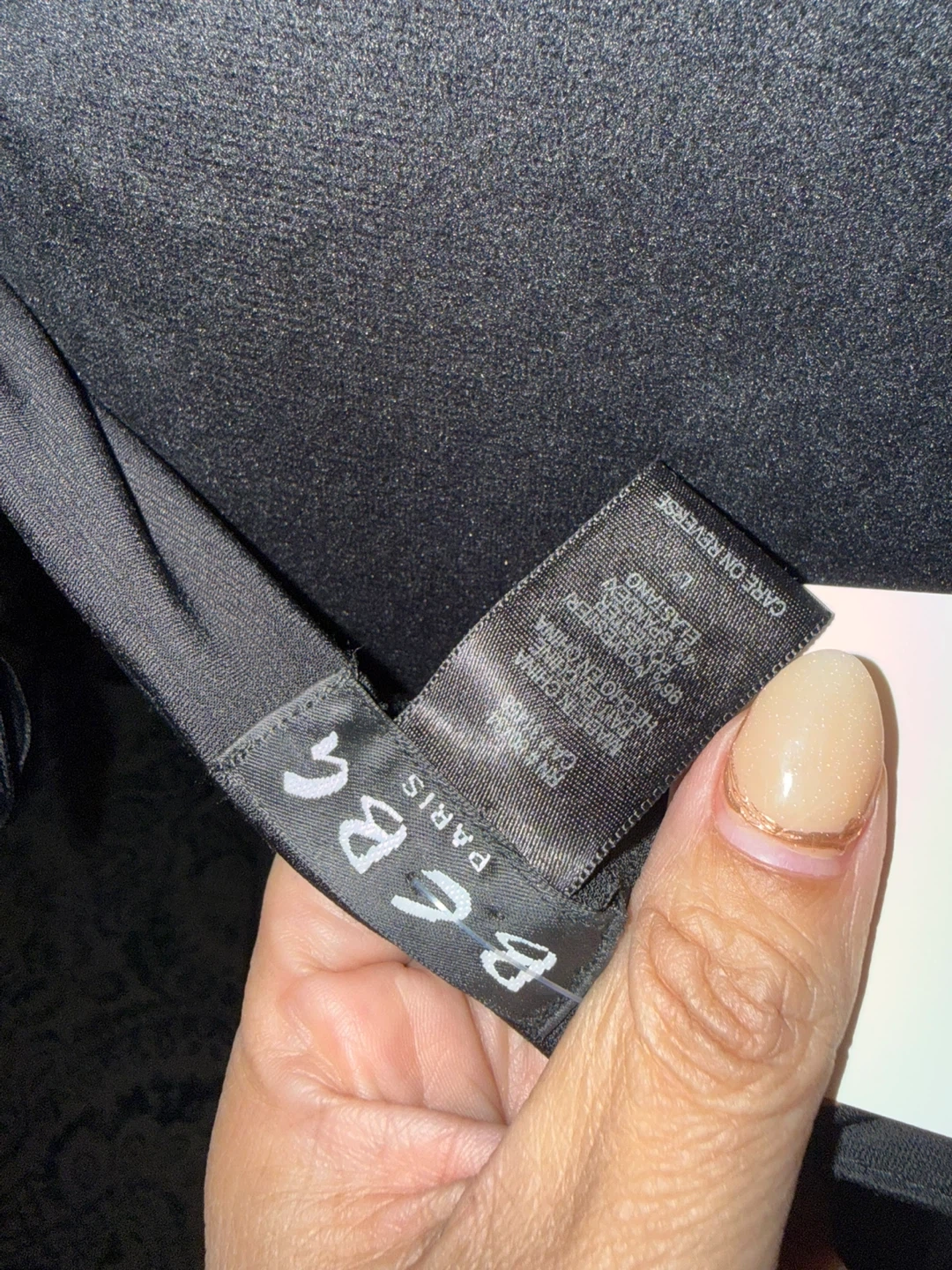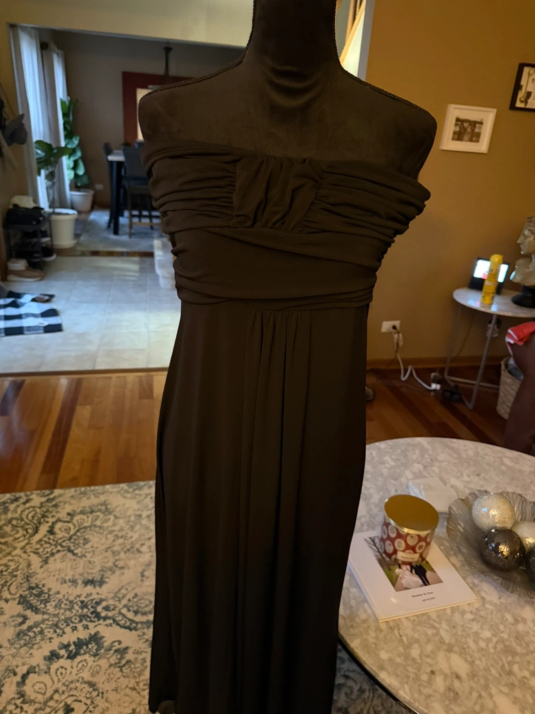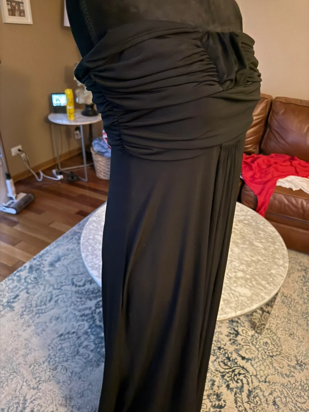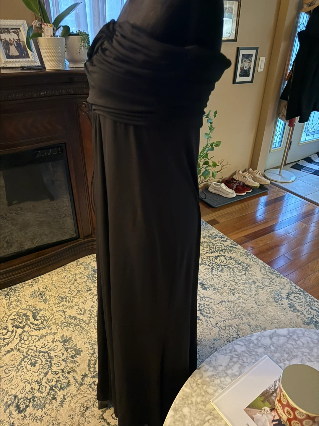 This is a black strapless gown by BCBG Paris. It's a size L and made from a blend of polyester and spandex. The dress features a ruched bodice and a flowing skirt.