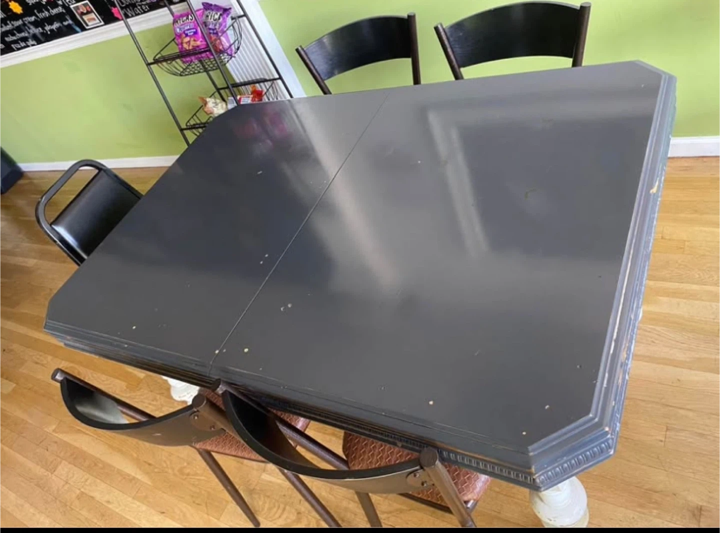 This is a gray dining table with an extendable leaf. It has a dark gray finish and decorative carved edges. The table's surface shows some minor wear consistent with normal use.