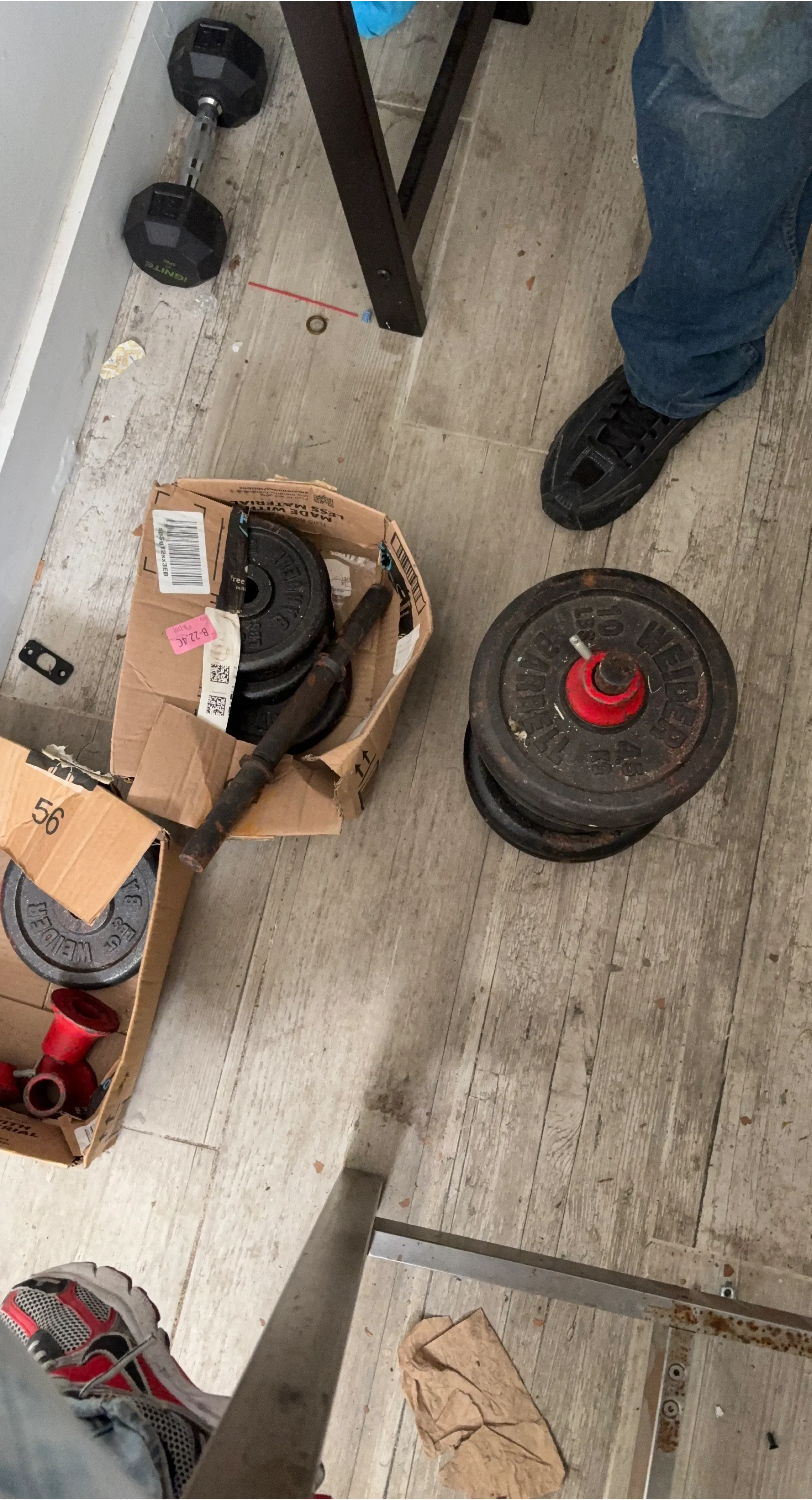 Selling a set of weight plates and a dumbbell handle. The plates are marked with "10 LBS" and "5 LBS". Perfect for home workouts!