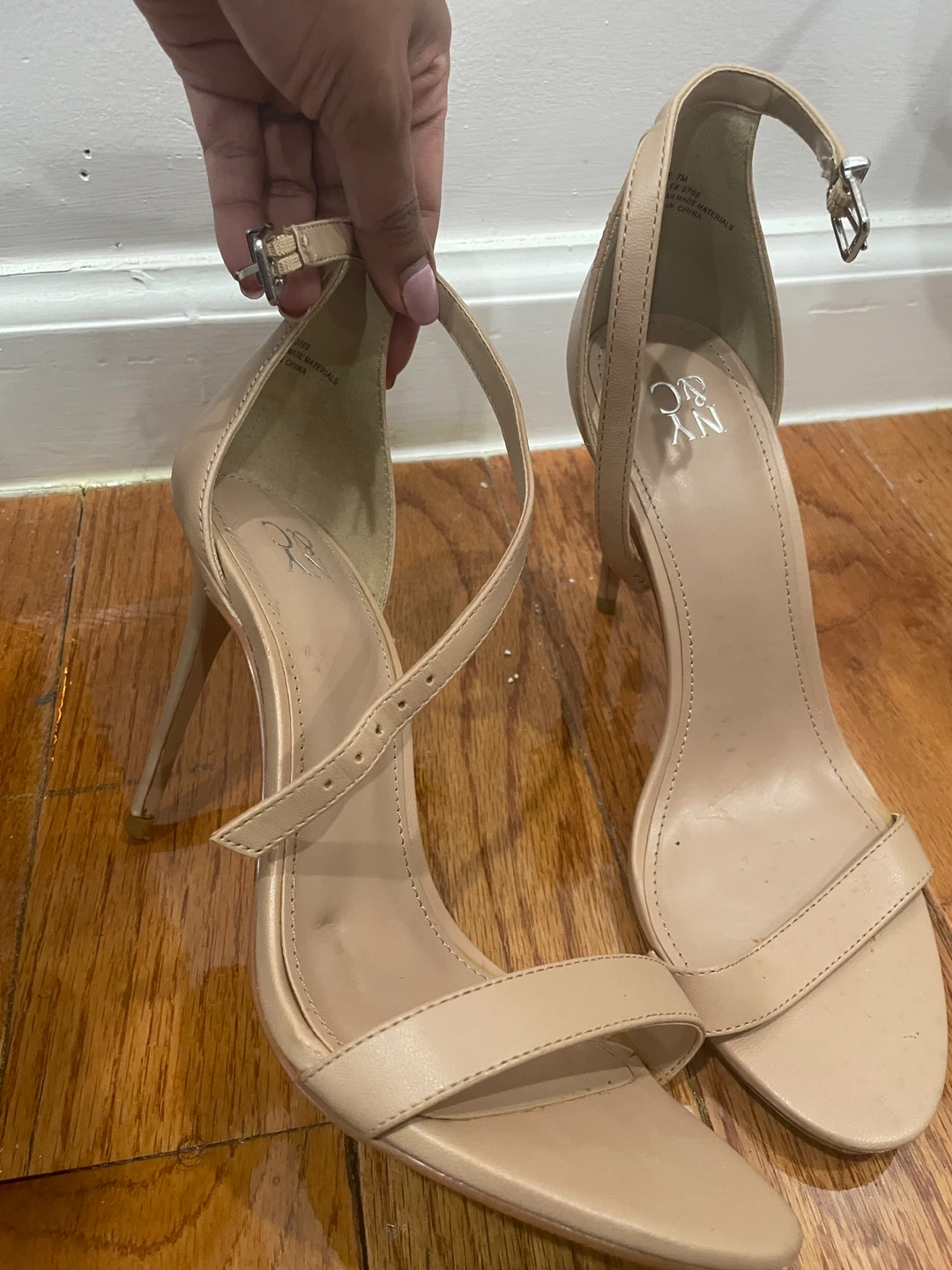 These tan ankle strap heels are from NY & Co. They feature a classic design with an adjustable ankle strap and a slim stiletto heel. Made with faux leather material for a chic look. These heels are a size 7 medium.