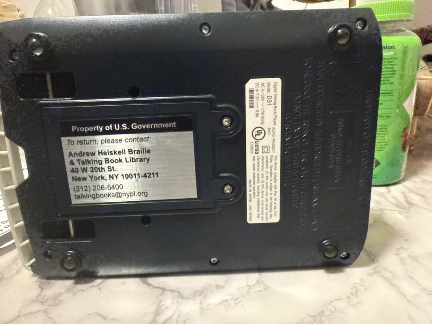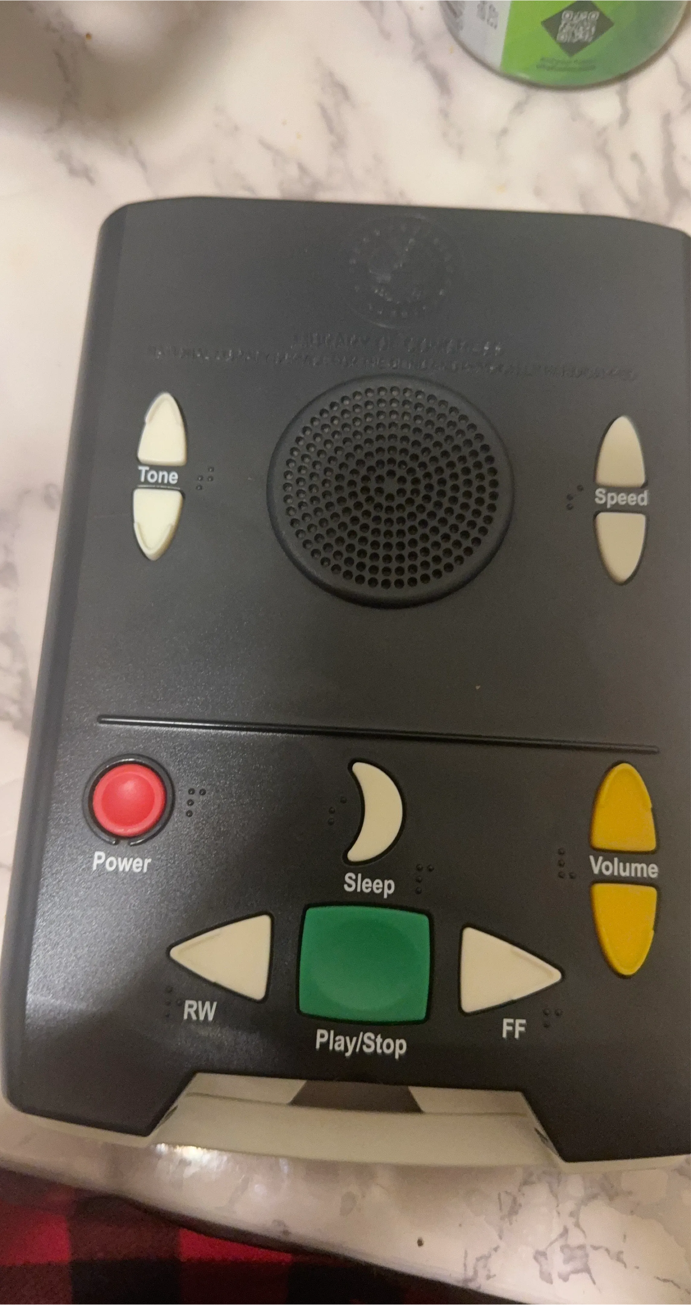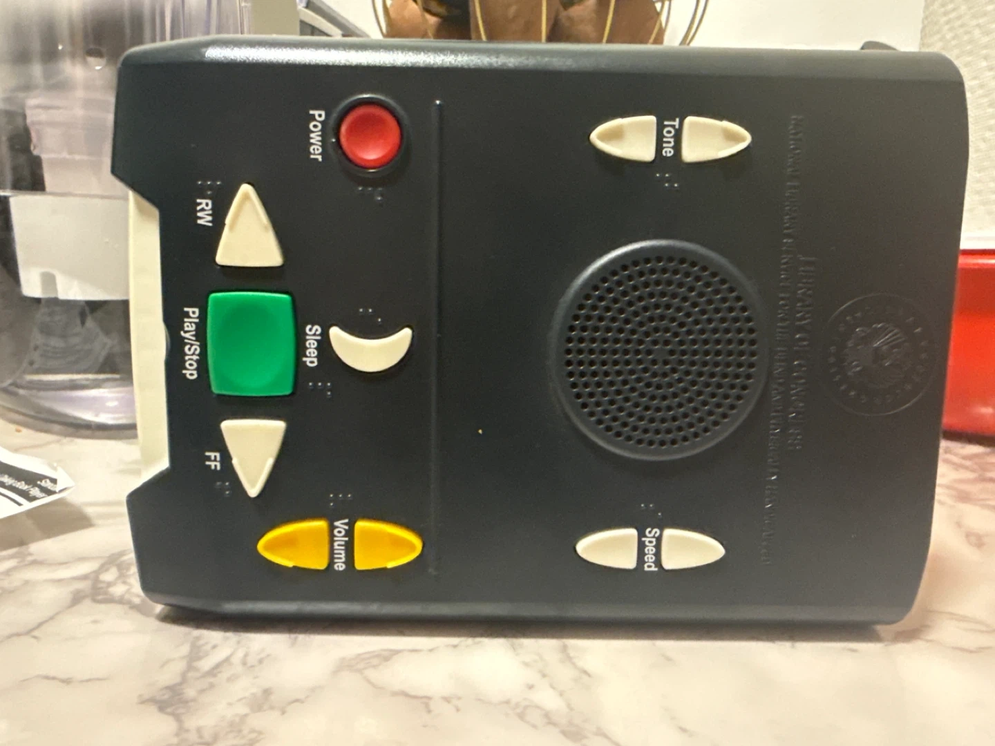Digital audio book player for visually impaired individuals. Features include power, sleep, tone, volume, speed, rewind, play/stop, and fast forward controls. It's designed for use with the U.S. Government's National Library Service for the Blind and Print Disabled program.