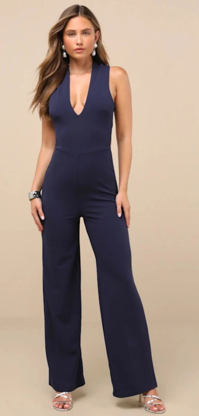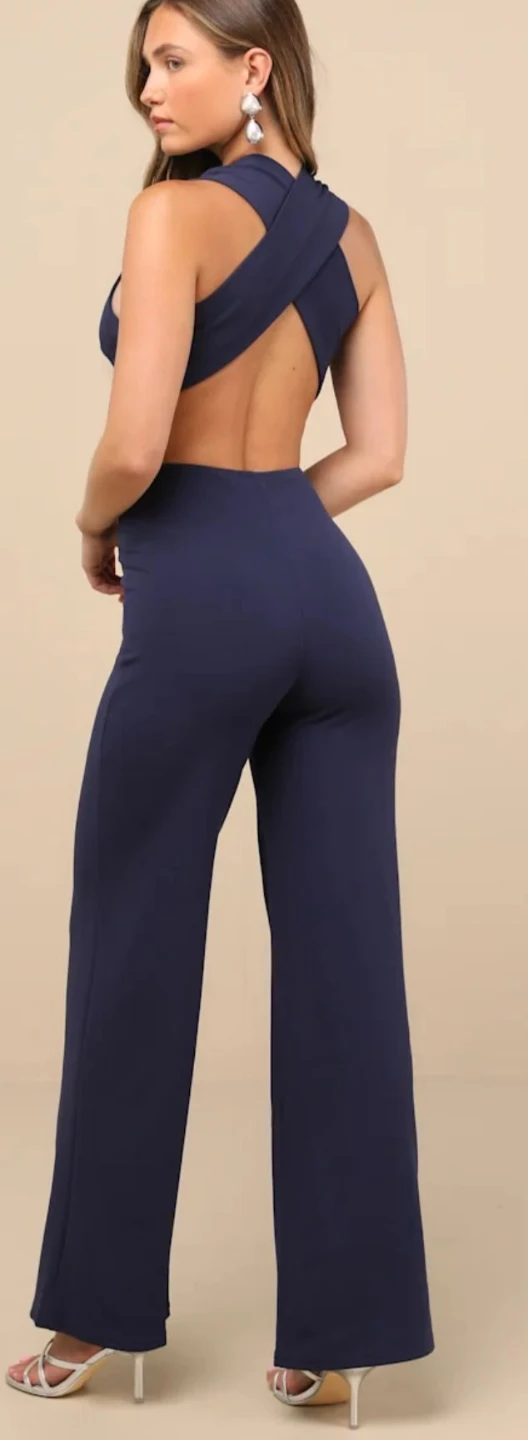 Selling a navy blue jumpsuit. It's in great condition and ready for a new owner! The jumpsuit features a halter neck and wide-leg pants.
