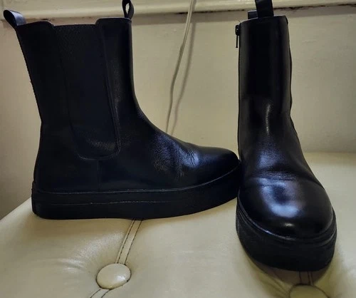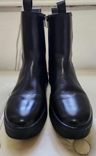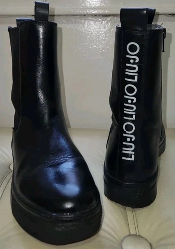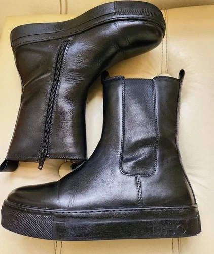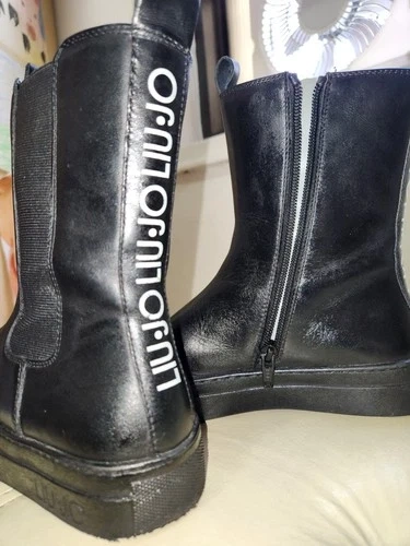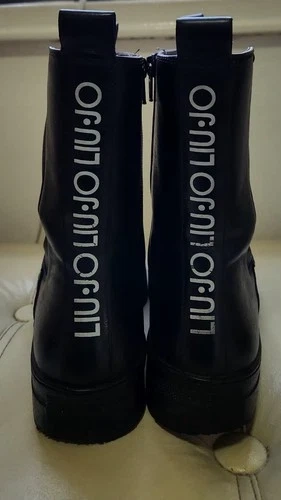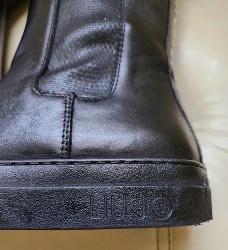 Stylish black leather LIU•JO platform ankle boots with side zippers and bold logo detailing at the back. Perfect for pairing with jeans, leggings, or dresses for an elevated street-style look. Brand: LIU•JO. Color: Black. Material: Genuine leather upper. Size: EU 35 / US 5. Style: Platform Chelsea ankle boots. Closure: Side zipper & elastic panel. Logo: LIU•JO printed vertically on the back. Outsole: Non-slip rubber sole. Details: Cushioned insole for comfort, pull tab at back. Approx. heel height: 1.5". Made in Italy. Condition Notes: Clean and polished; minor scuffing on sole edges (see close-up photo). Gently used – excellent overall condition with minor creasing and light wear on soles (see photos).