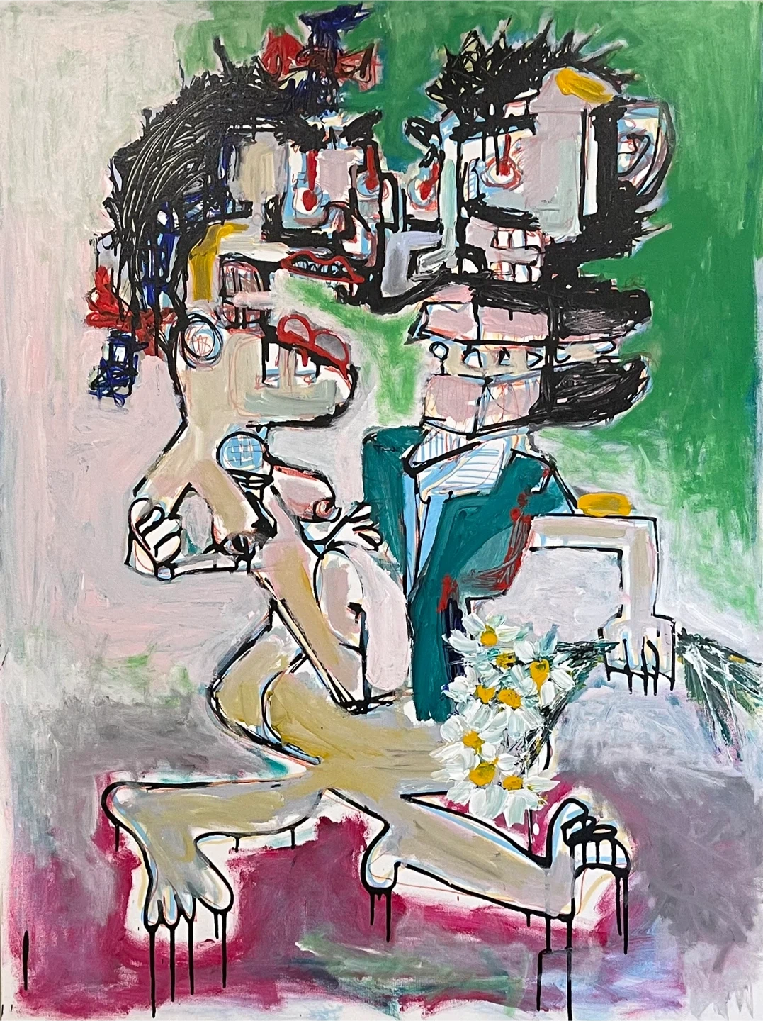 This is an original abstract painting featuring stylized figures and a bouquet of flowers. It's rendered with bold brushstrokes and a vibrant color palette. The canvas is large and ready to be a statement piece for your collection. It would make a striking addition to any contemporary art display.
