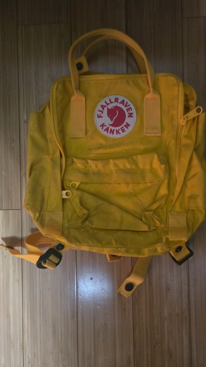 This is a yellow Fjallraven Kanken backpack. It's made of durable synthetic material. Features adjustable shoulder straps and a front zipper pocket.
