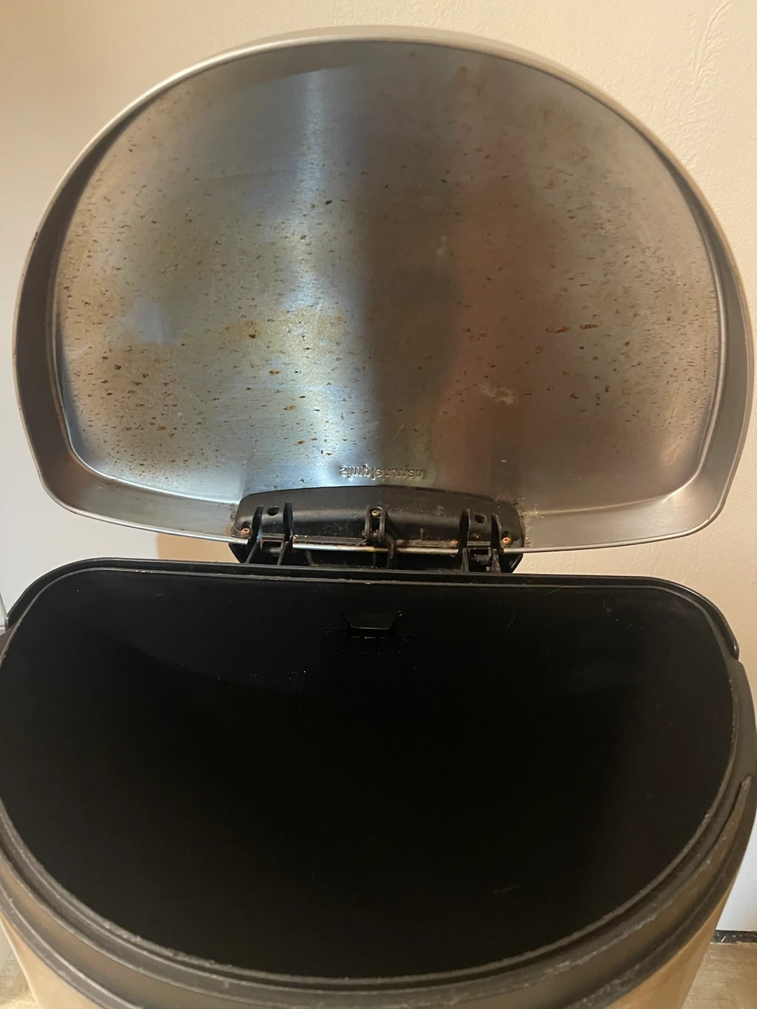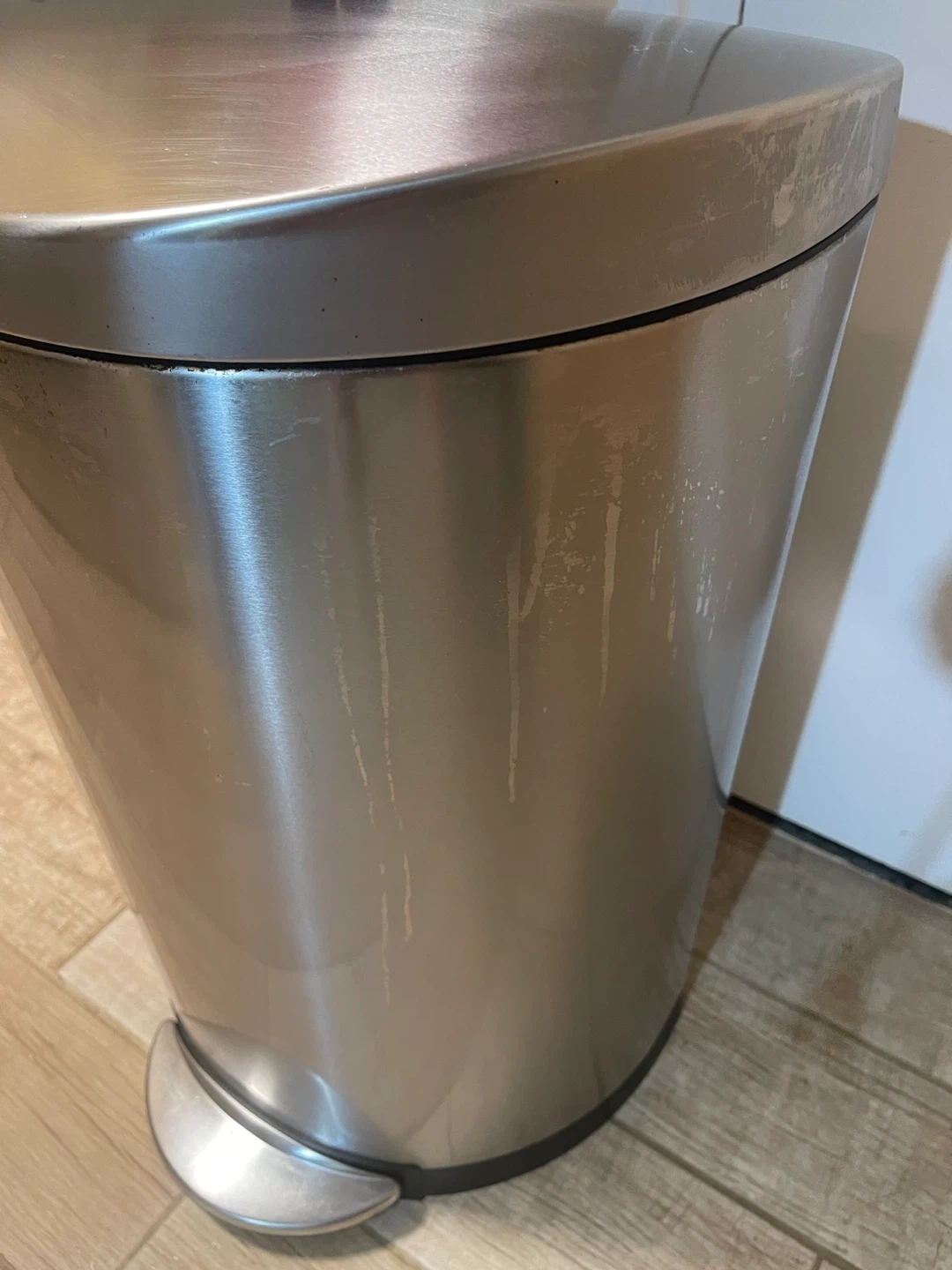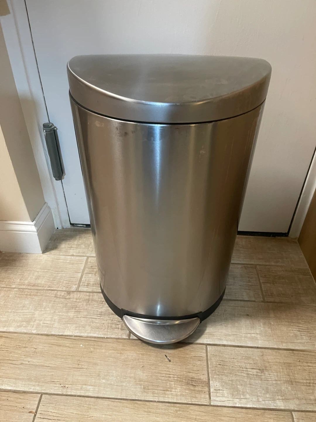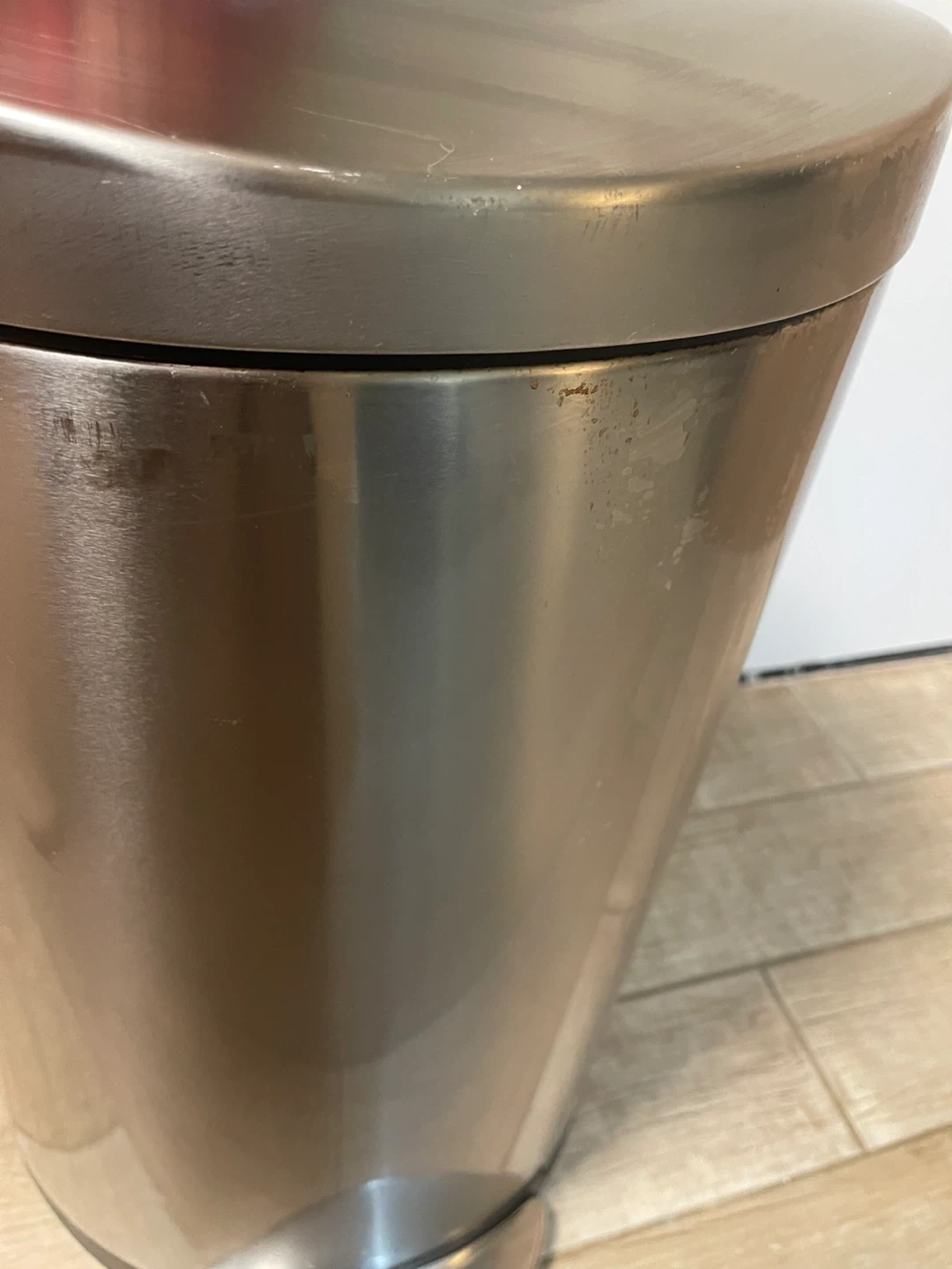 This is a simplehuman trash can with a stainless steel finish. It is in used condition and shows some signs of wear and tear. Please see the photos for details! Foot pedal and quiet close.