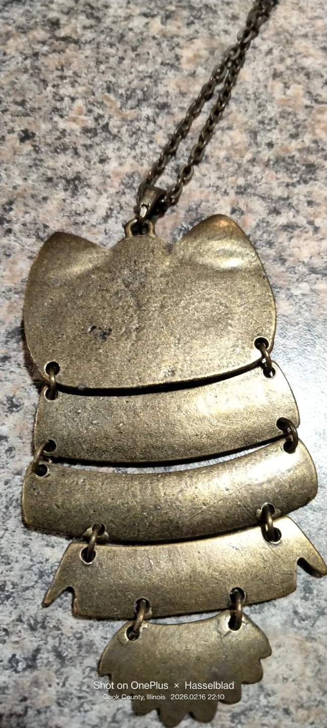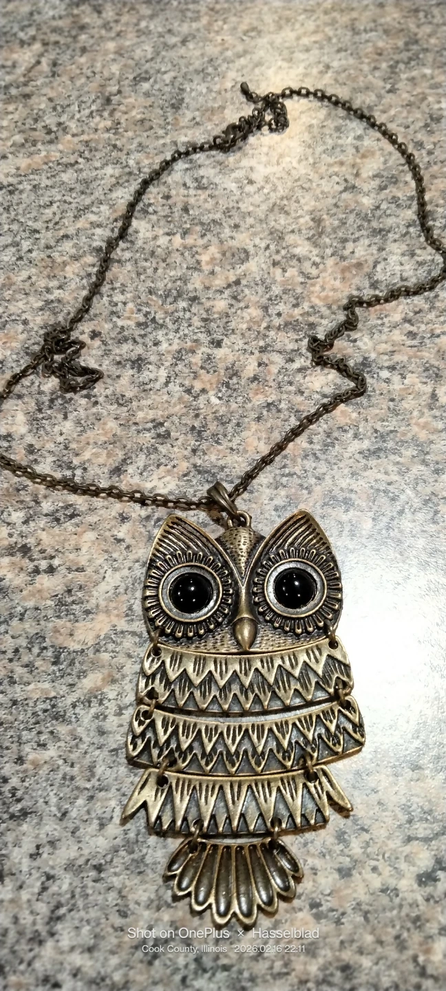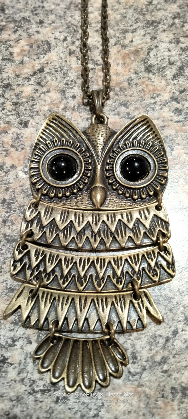 A vintage-style owl pendant necklace with two black gemstone eyes. The pendant has a detailed, layered design and hangs from a bronze-colored chain. This piece adds a unique touch to any outfit!