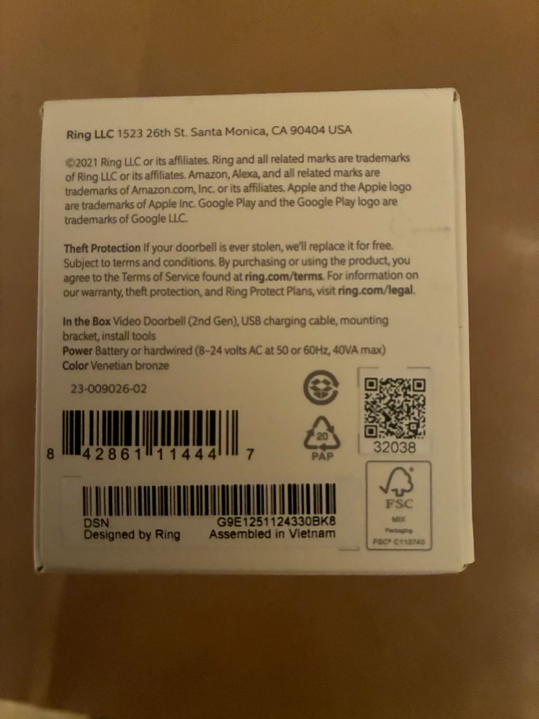 Ring Video Doorbell (2nd Gen) in Venetian bronze. It's powered by a battery or hardwired for continuous power. Includes USB charging cable, mounting bracket, and install tools.