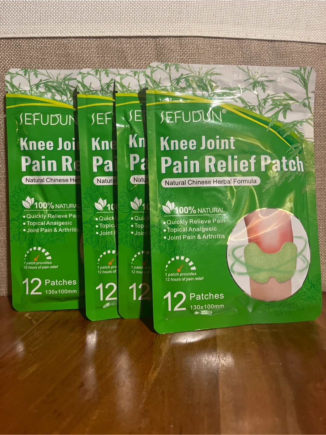 This listing is for SEFUDUN Knee Joint Pain Relief Patches. It's a natural Chinese herbal formula for pain relief. Each patch provides 12 hours of pain relief. Patches are 130x100mm. 12 patches per pack. 48 total.