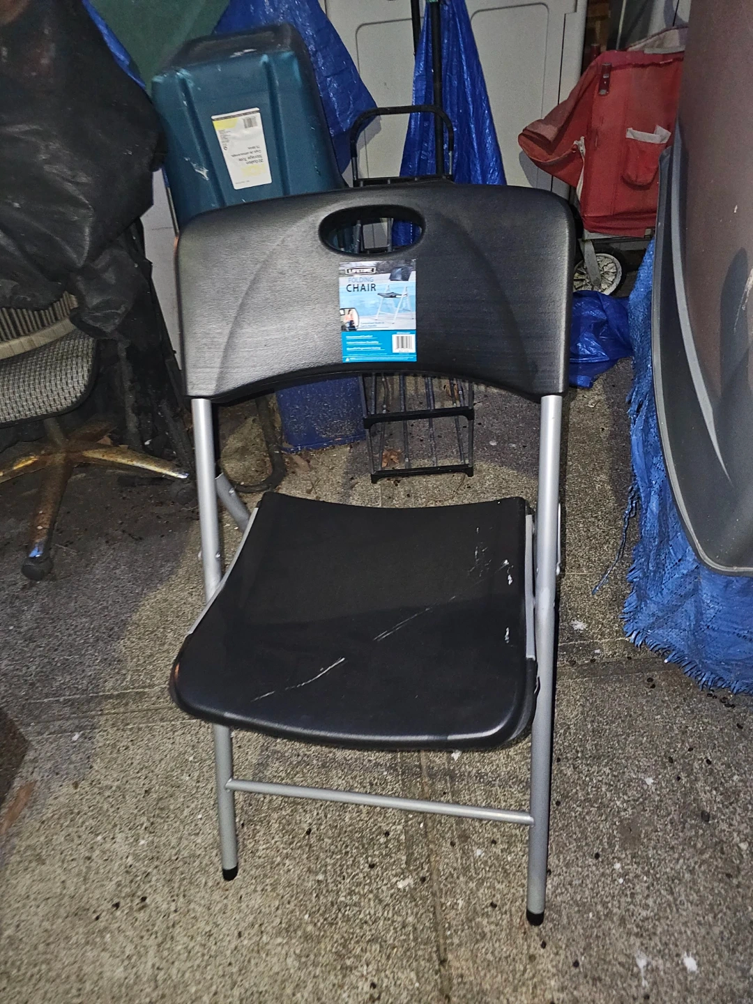 This is a black Lifetime folding chair. It's made of plastic and has a steel frame. This chair is lightweight and easy to store.
