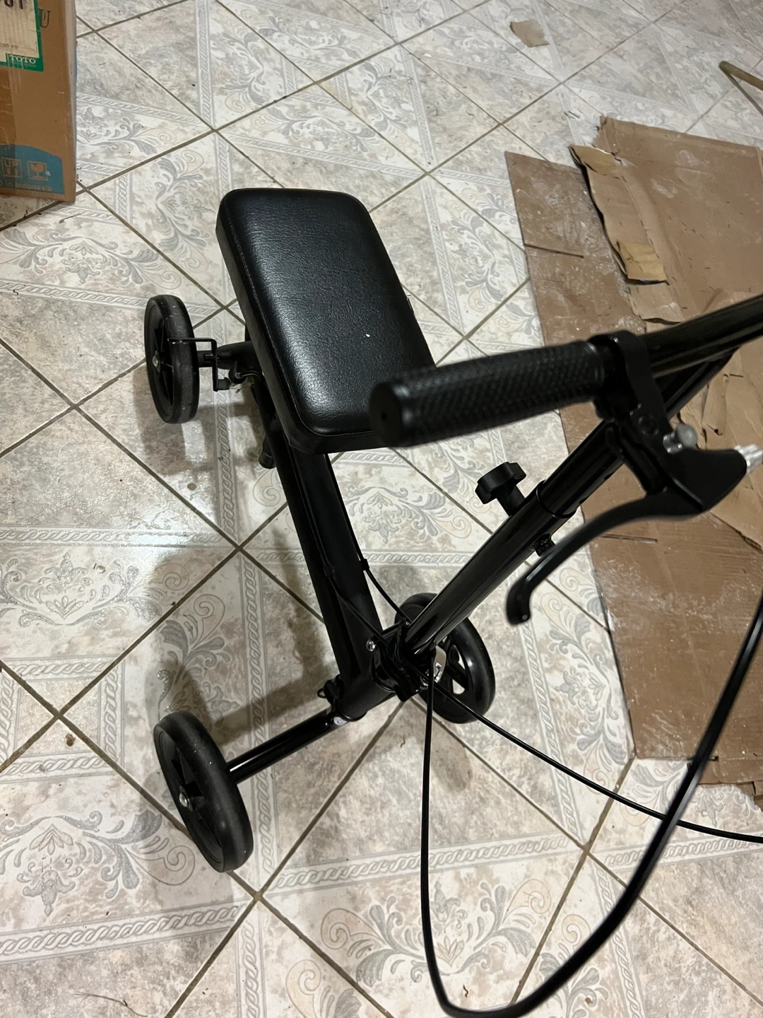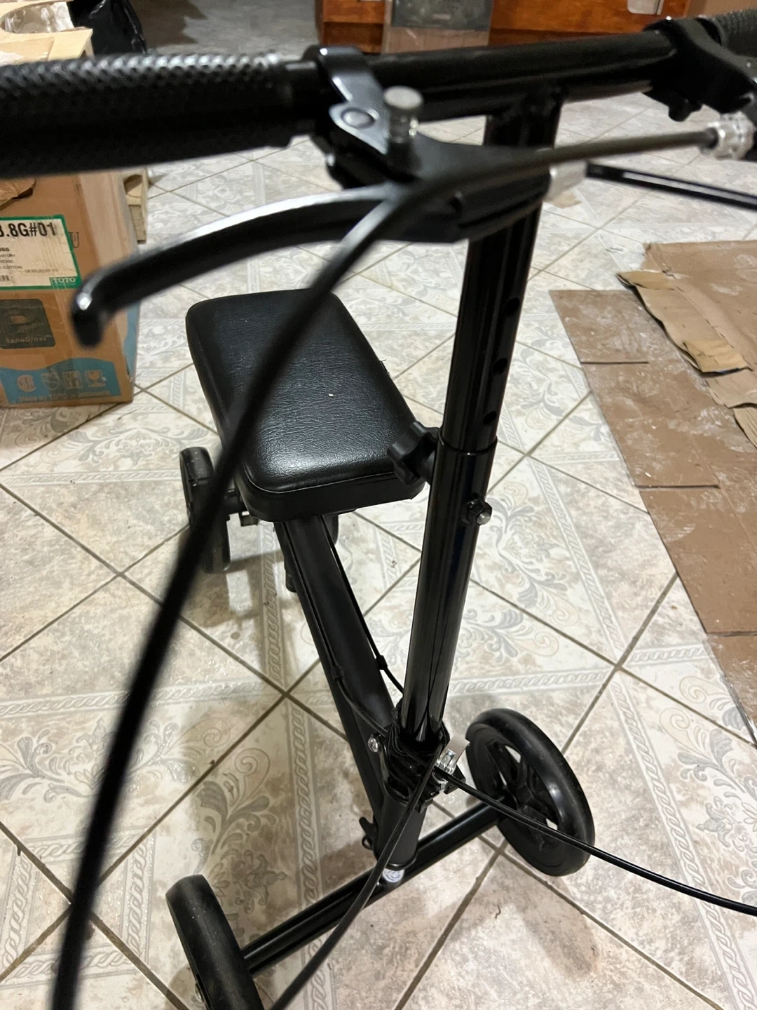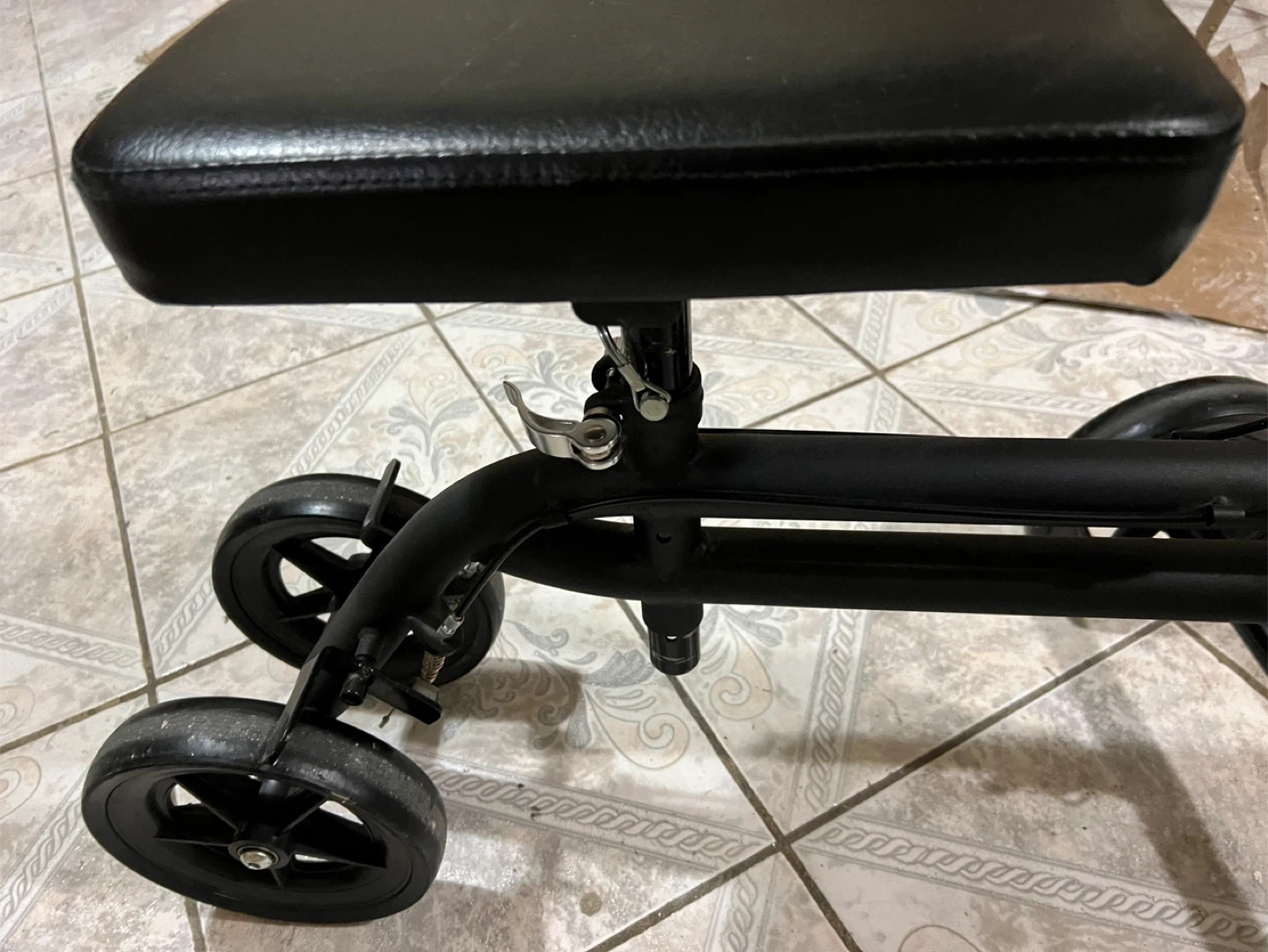 Selling a knee walker scooter in black. It has a comfortable seat and is easy to maneuver around the house. Great for getting around while recovering from a foot or ankle injury!