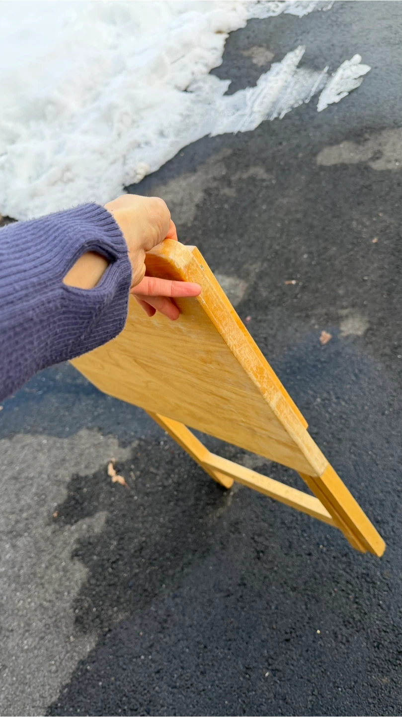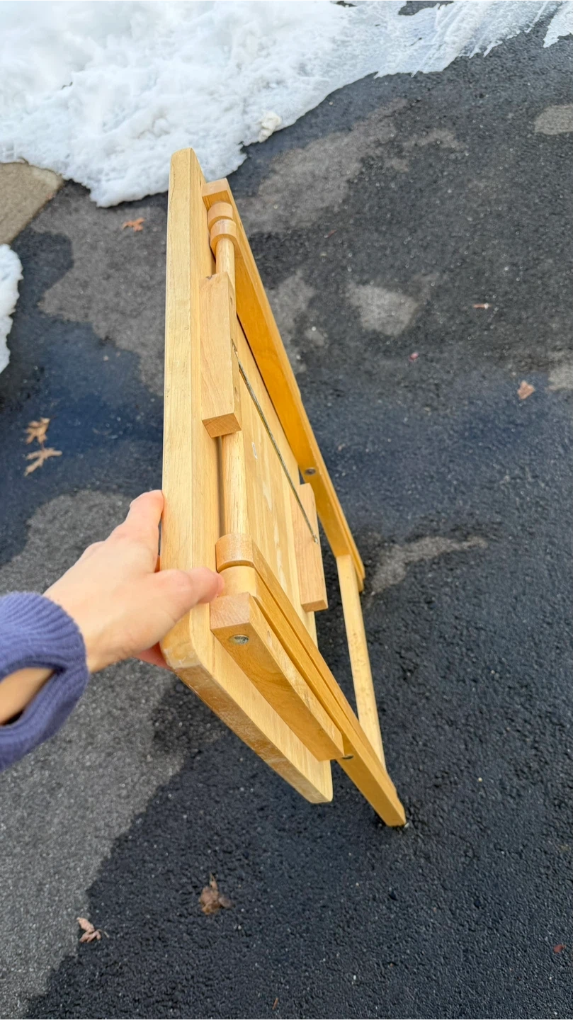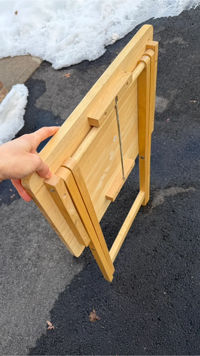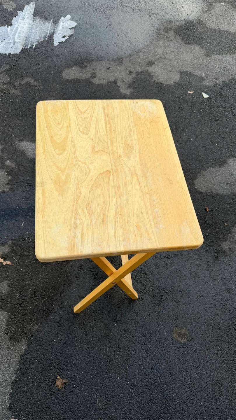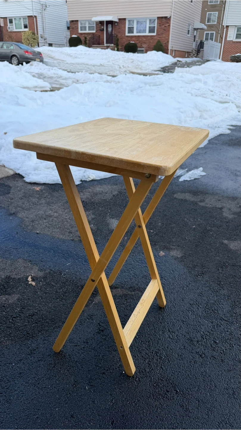 This is a wooden folding TV tray table. It's made of light-colored wood and has a criss-cross leg design for stability. It folds flat for easy storage. It's a convenient surface for snacks or a laptop!