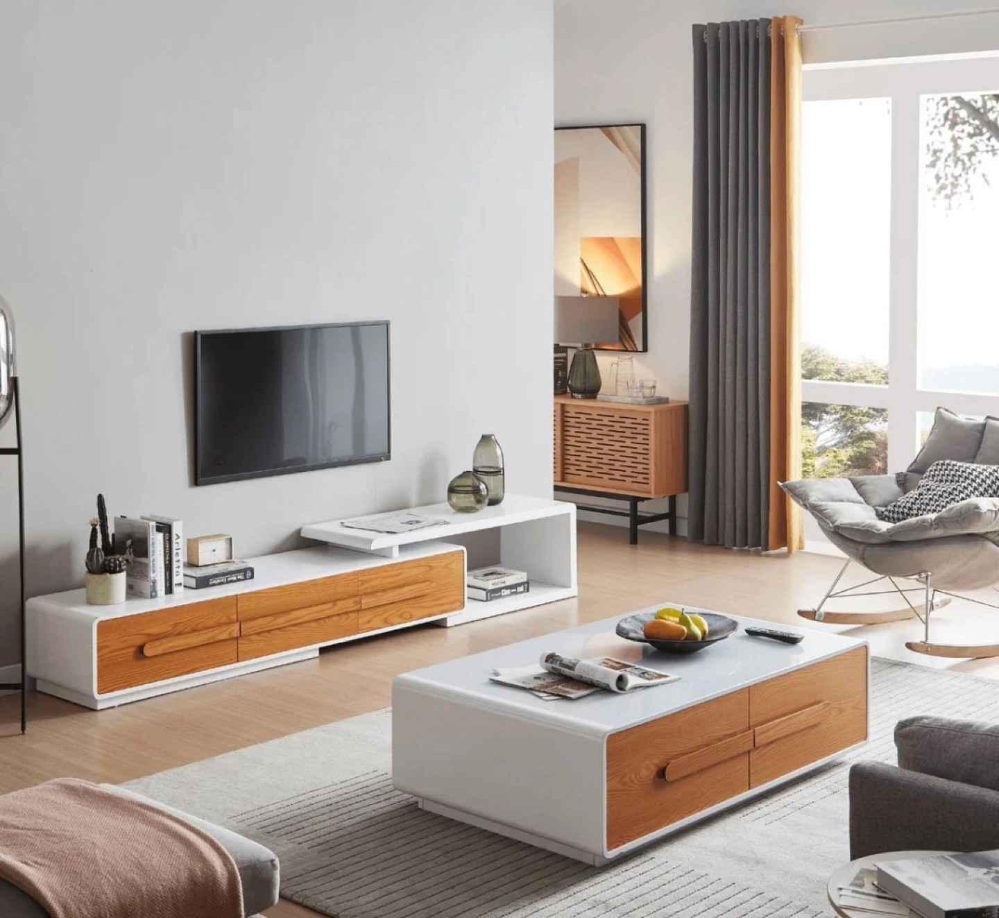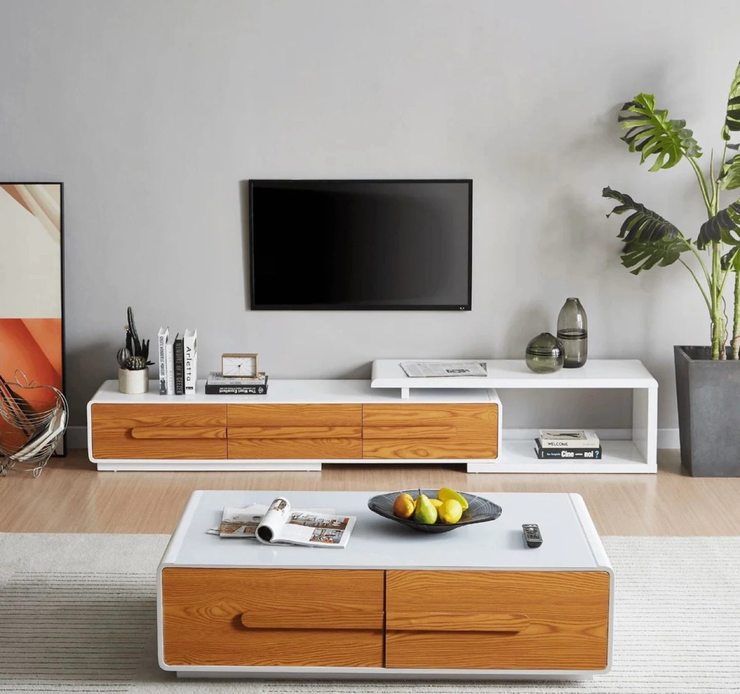 Modern White glass and Wood TV Stand and Coffee Table Set