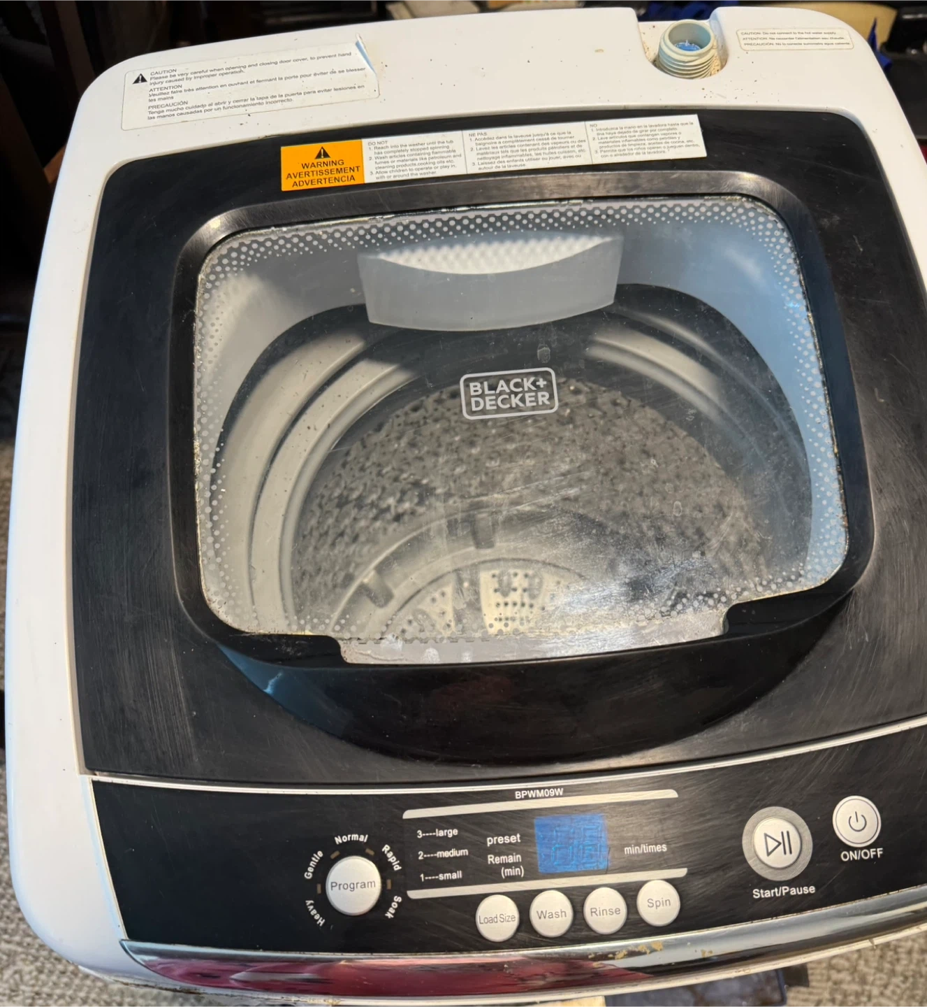 This is a Black+Decker portable washing machine. It features multiple wash programs including Normal, Gentle, Rapid, Heavy, and Soak. You can select load size, wash, rinse, or spin cycles. The timer can be set in minutes.