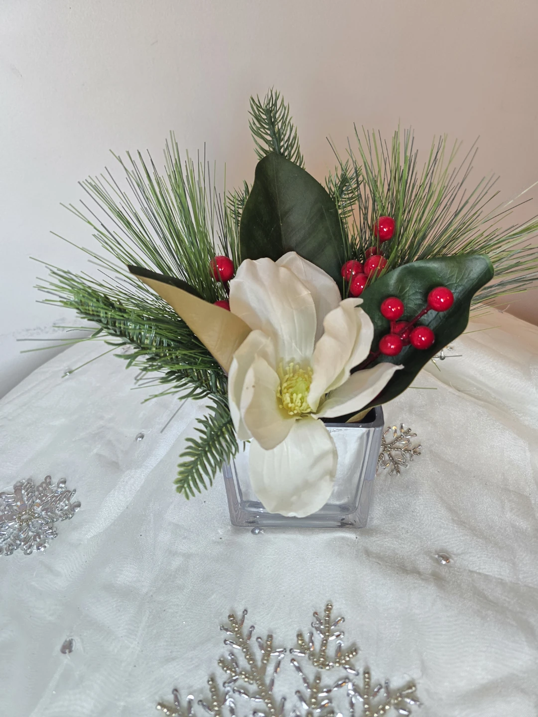 This is a lovely floral arrangement featuring a white magnolia, pine needles, and red berries in a clear glass vase. It would make a beautiful centerpiece or addition to any room