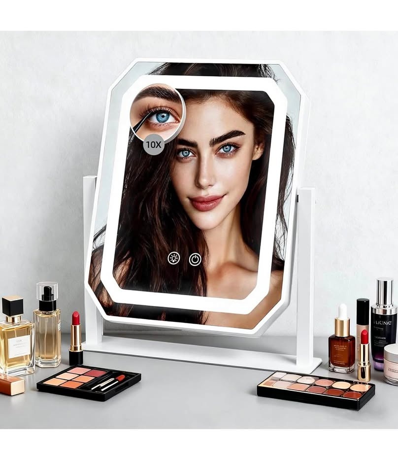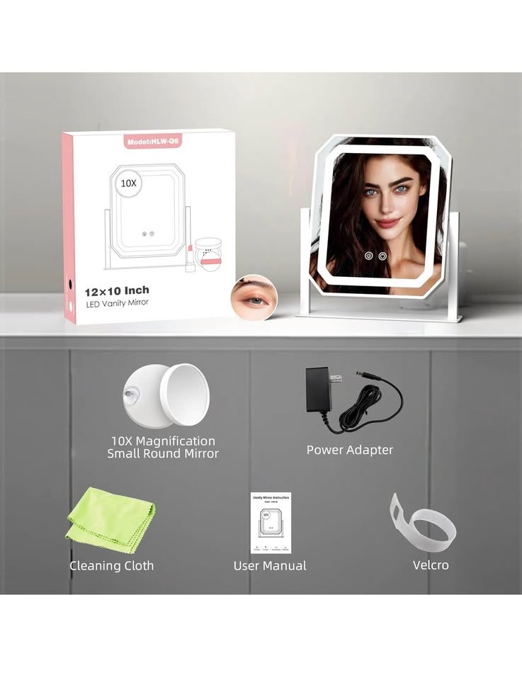 Lighted Makeup Mirror, 3 Colors for Precise Application, Touch Control Brightness Adjustment for Easy Use, with a Detachable 10x Magnifying Mirror, 12“ x 10” Hollywood Vanity Mirror for Plug-in Use