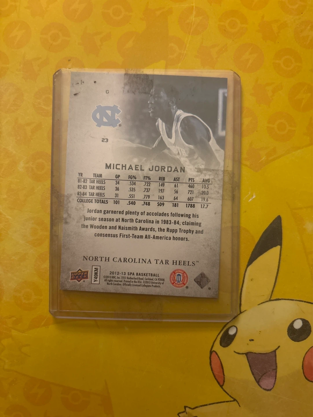 This is a 2012-13 Upper Deck SP Authentic basketball card featuring Michael Jordan during his time with the North Carolina Tar Heels. It showcases his collegiate career stats and achievements. A great collectible for any basketball fan!