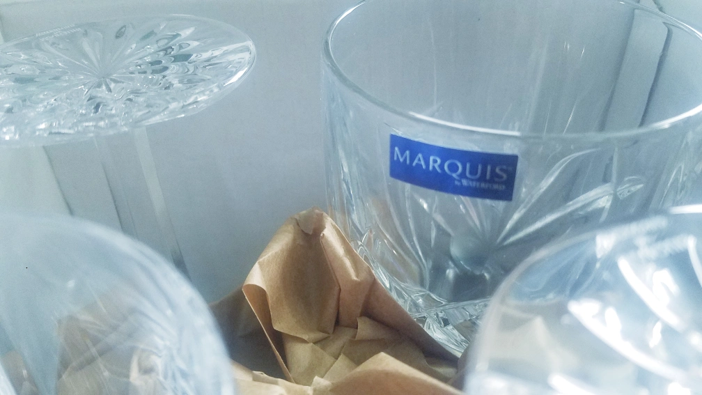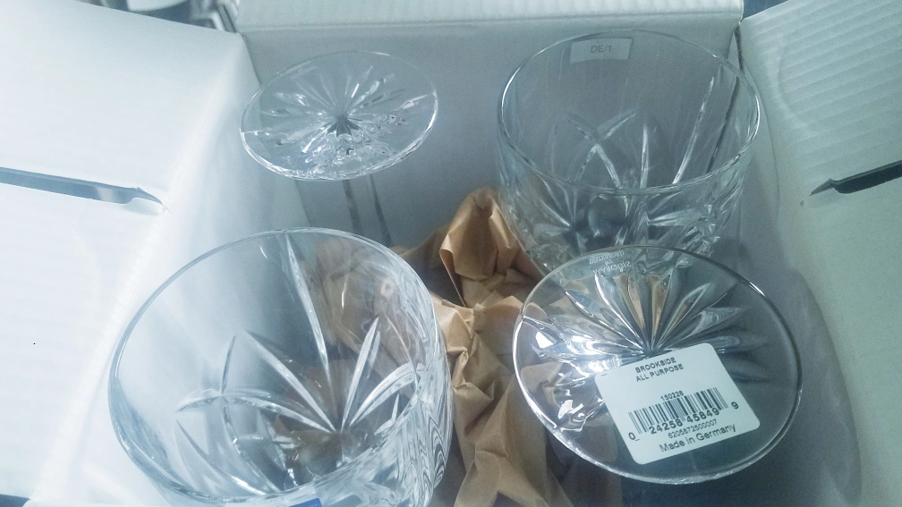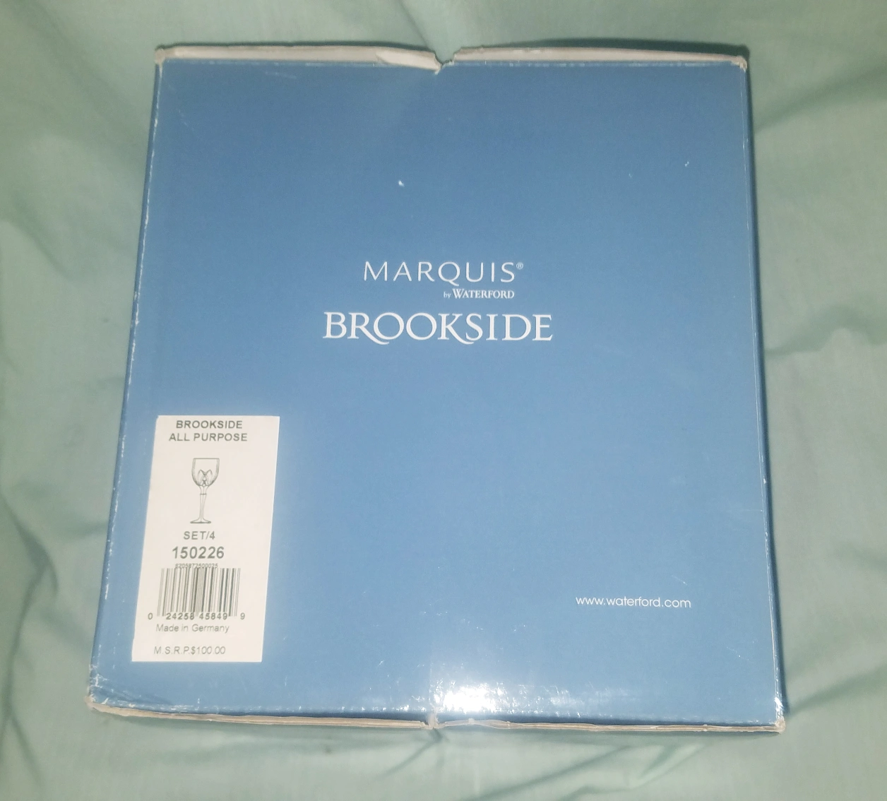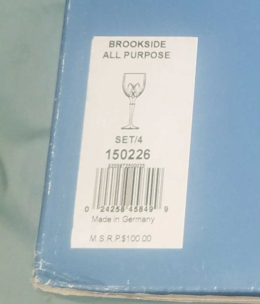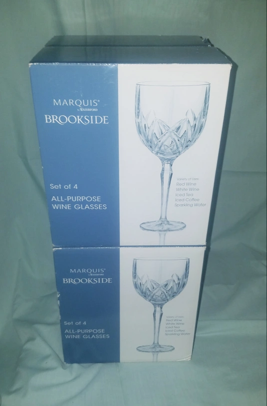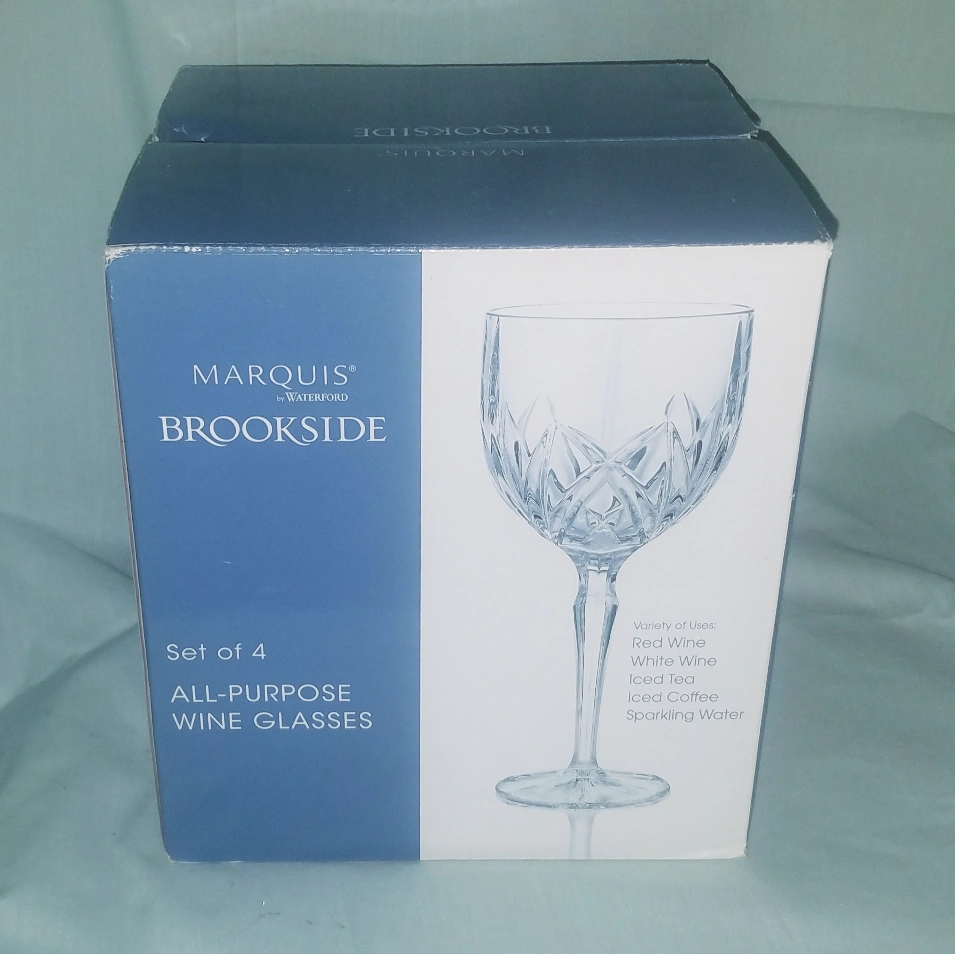 These Glasses Were Never Used They Come in the Original Boxes...Boxes Have Some Shelf Wear Approx. 8.75" Tall Please See Pics... Check Out My Page For Other Great Items!! Selling two sets of 4 Marquis by Waterford Brookside all-purpose wine glasses! They are made in Germany and come in their original boxes. The box indicates they can be used for a variety of uses such as red wine, white wine, iced tea, iced coffee, and sparkling water. The MSRP on the box is $100.00 for each set