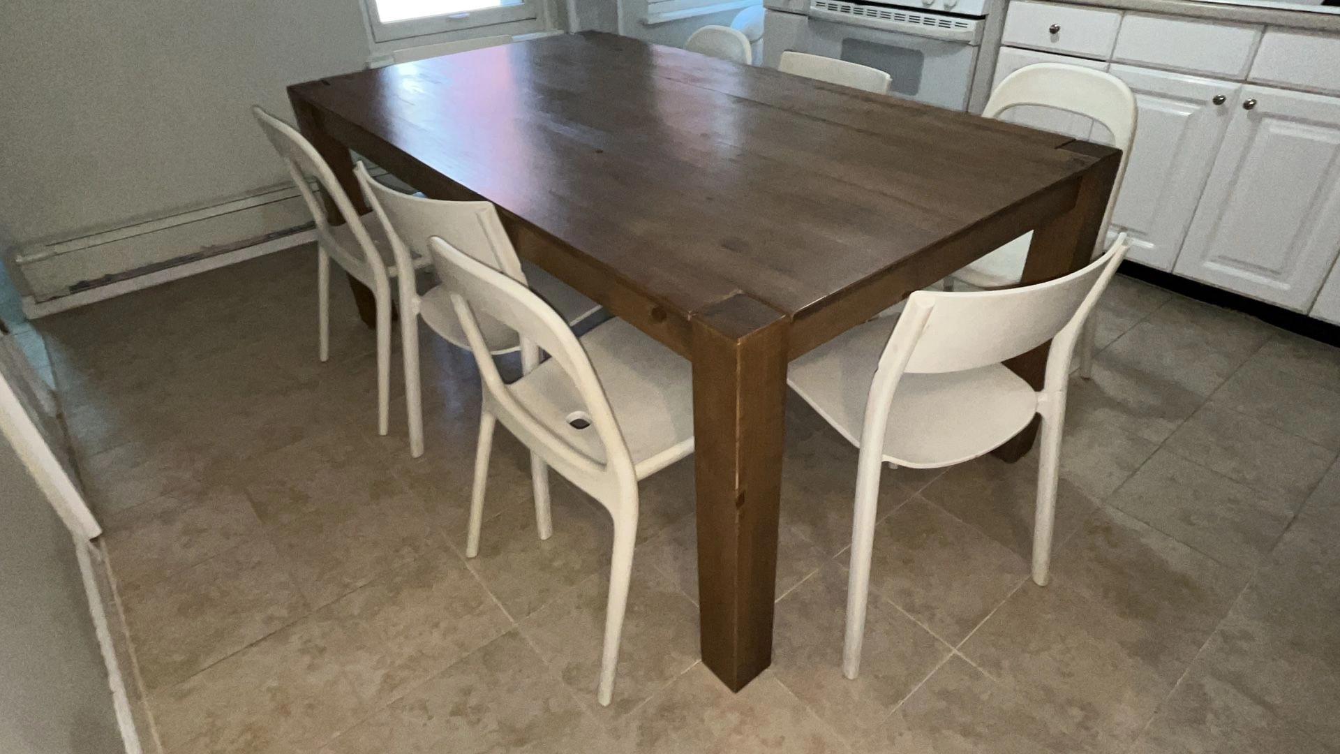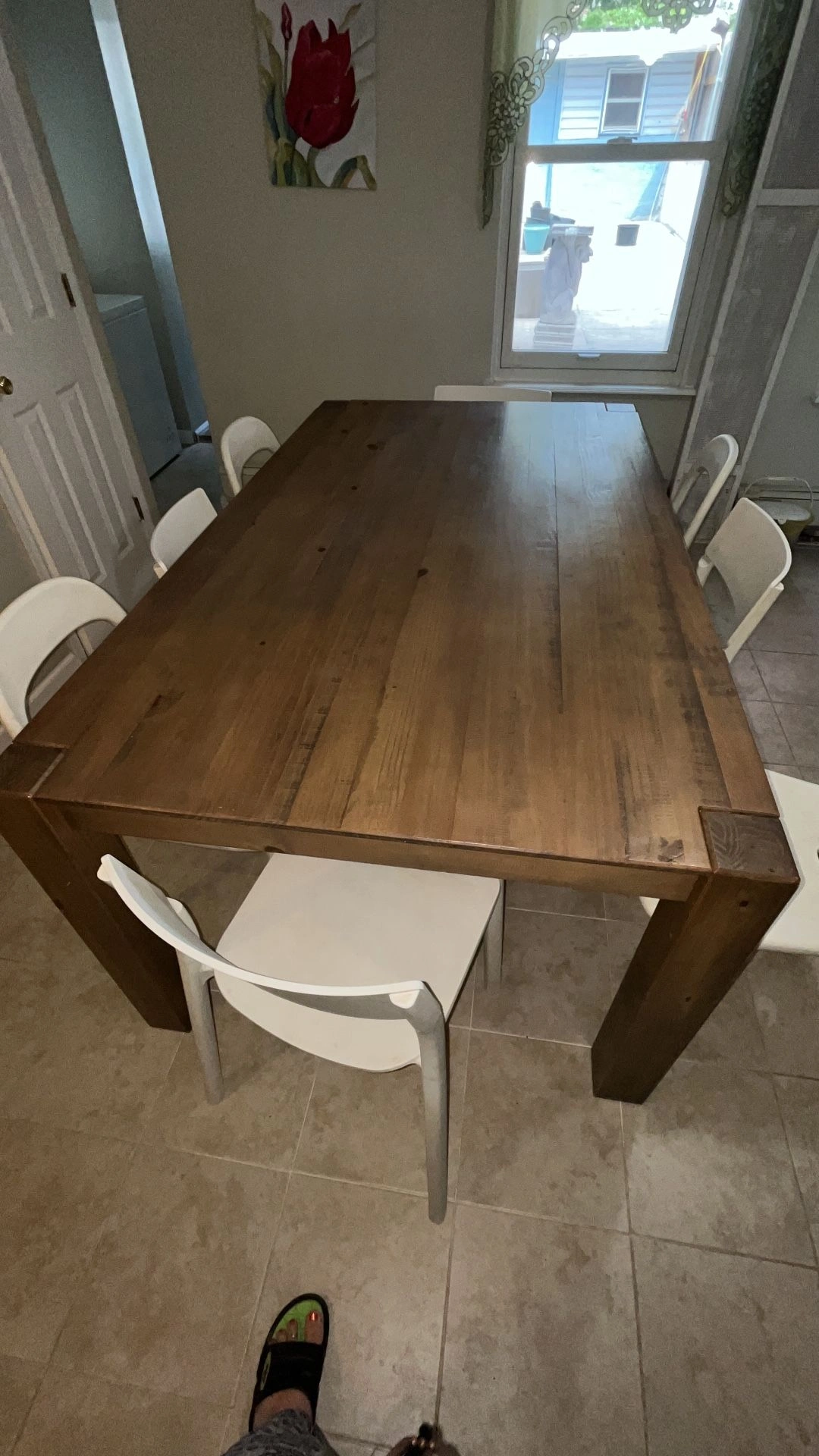 10Originally over $500 41 1/4” wide About 6 feet long 29 3/4 height From world market Like new! World market Graywashed Pine Rylie Dining Table Crafted of solid pine wood with graywashed finish Seats 8 Due to natural materials, slight variations may occur Wipe clean with dry cloth World Market exclusive Made in Brazil Overall: 72"L x 41"W x 30"H, 99 lbs. Floor to apron: 25.75"H Between legs on end: 33.25"W Between legs on side: 64.25"W The gorgeous solid pine featured in our exclusive Rylie dining collection is plantation-grown and sustainably harvested. These expansive pieces are finished with a light graywashing that lets their natural woodgrain shine through.