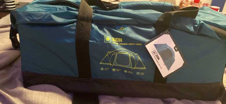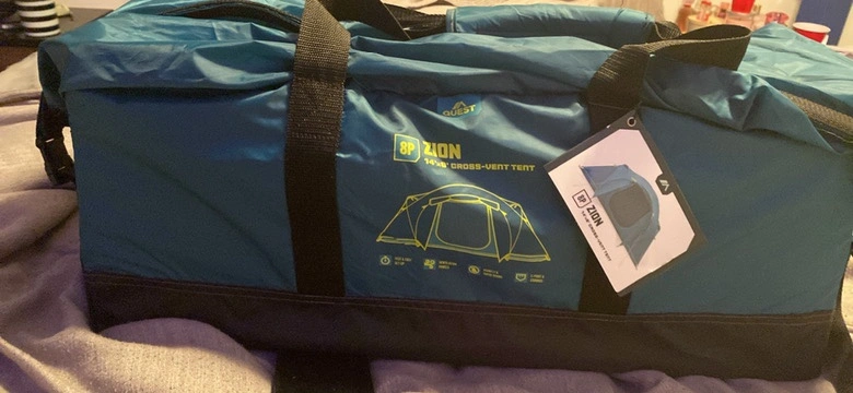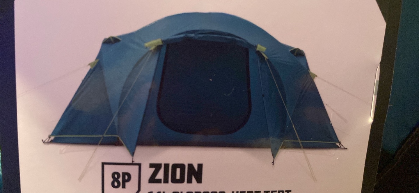 58 person tent with a blue and green color scheme. It is a cross-vent tent with a zippered door. It comes with a carrying bag. Brand new never opened