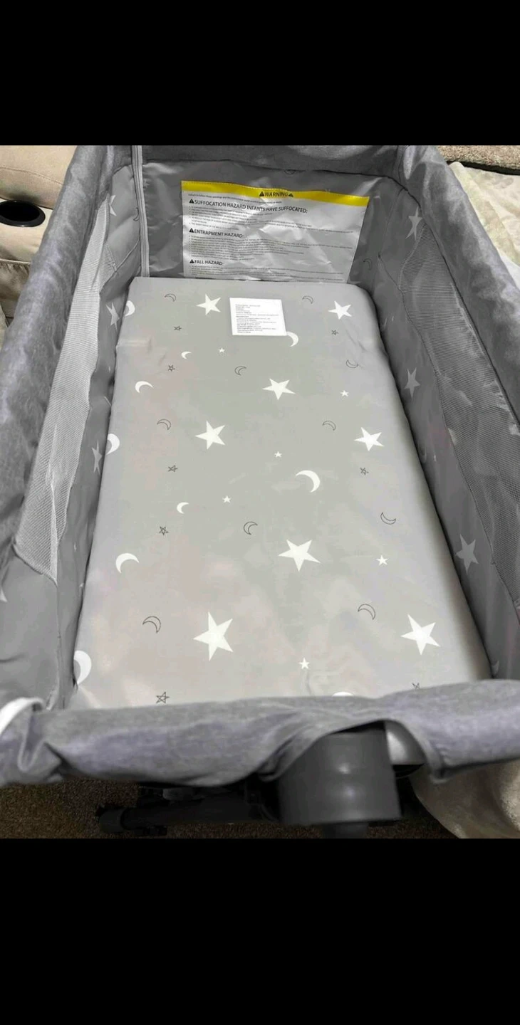 Selling a baby bassinet with a mosquito net. It's in great condition and ready for a new baby! The bassinet is gray and white, and it has a cute star and moon pattern on the mattress pad. Perfect for keeping your little one safe and comfortable