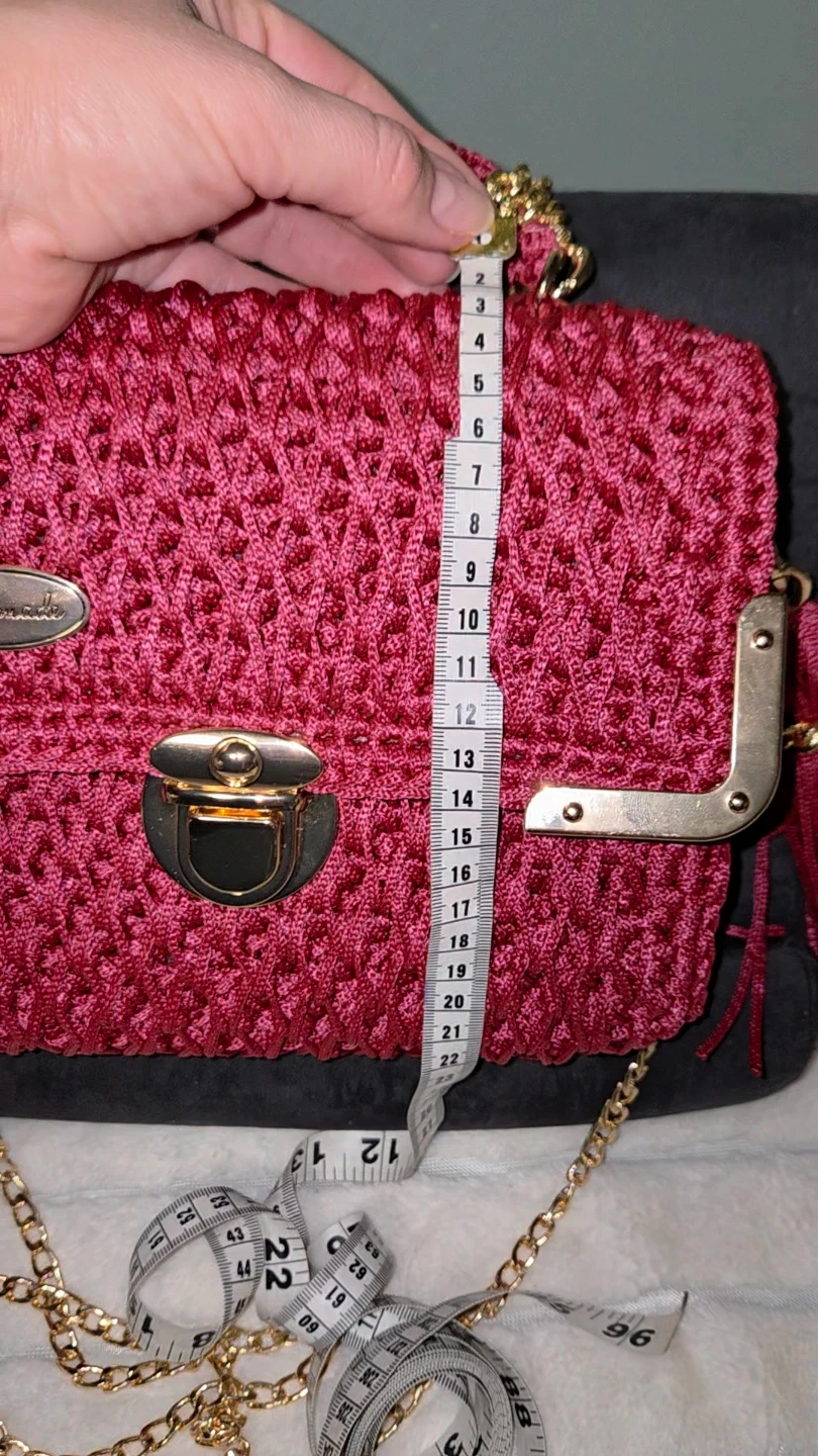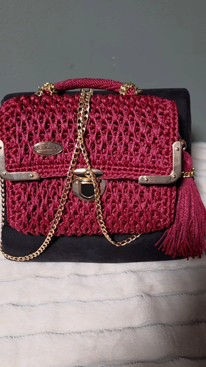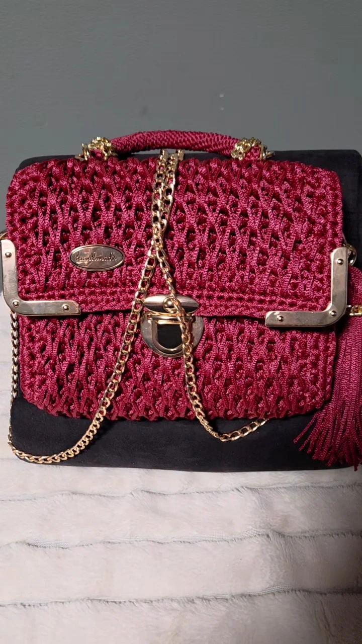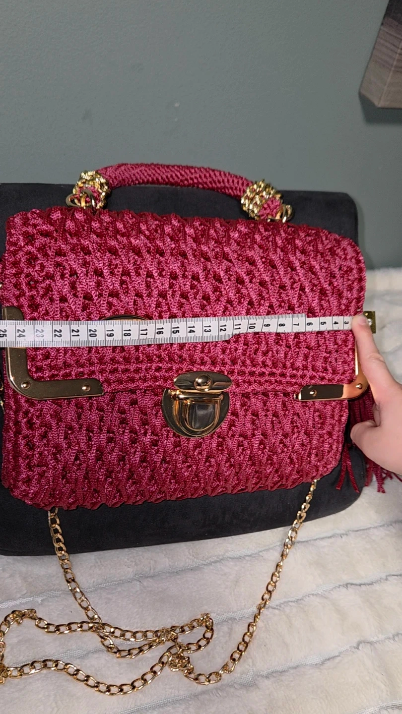 Selling a beautiful handmade burgundy crochet bag! It features a gold chain and a unique design. The bag measures about 10 inches in length and 8 inches in height. It's perfect for adding a touch of handmade charm to your outfit