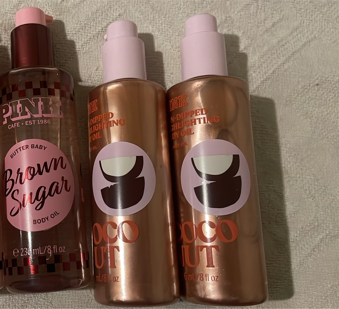 Get ready to glow with these PINK body oils! $20,00 each.I have a Brown Sugar body oil and a Coconut body oil. Each bottle contains 236 mL/8 fl oz.