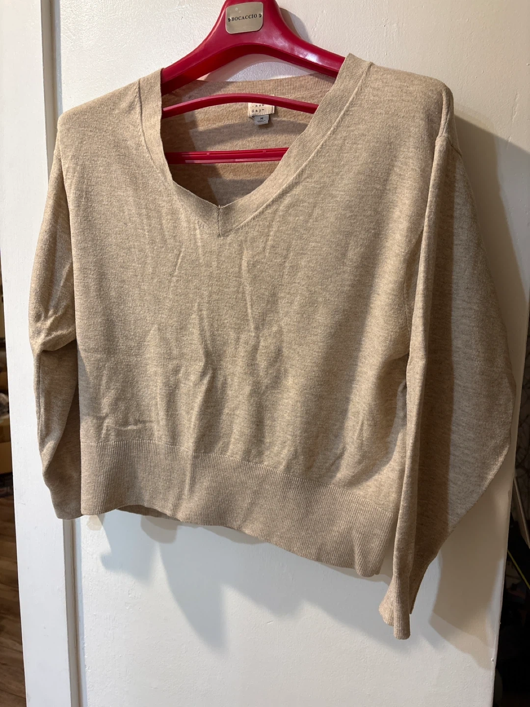 Selling a gently used beige V-neck sweater from A New Day. It's a size M and in great condition. Perfect for layering or wearing on its own!