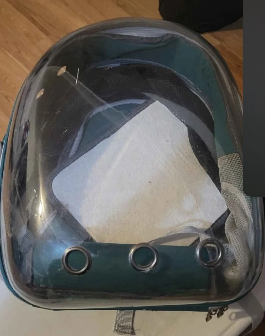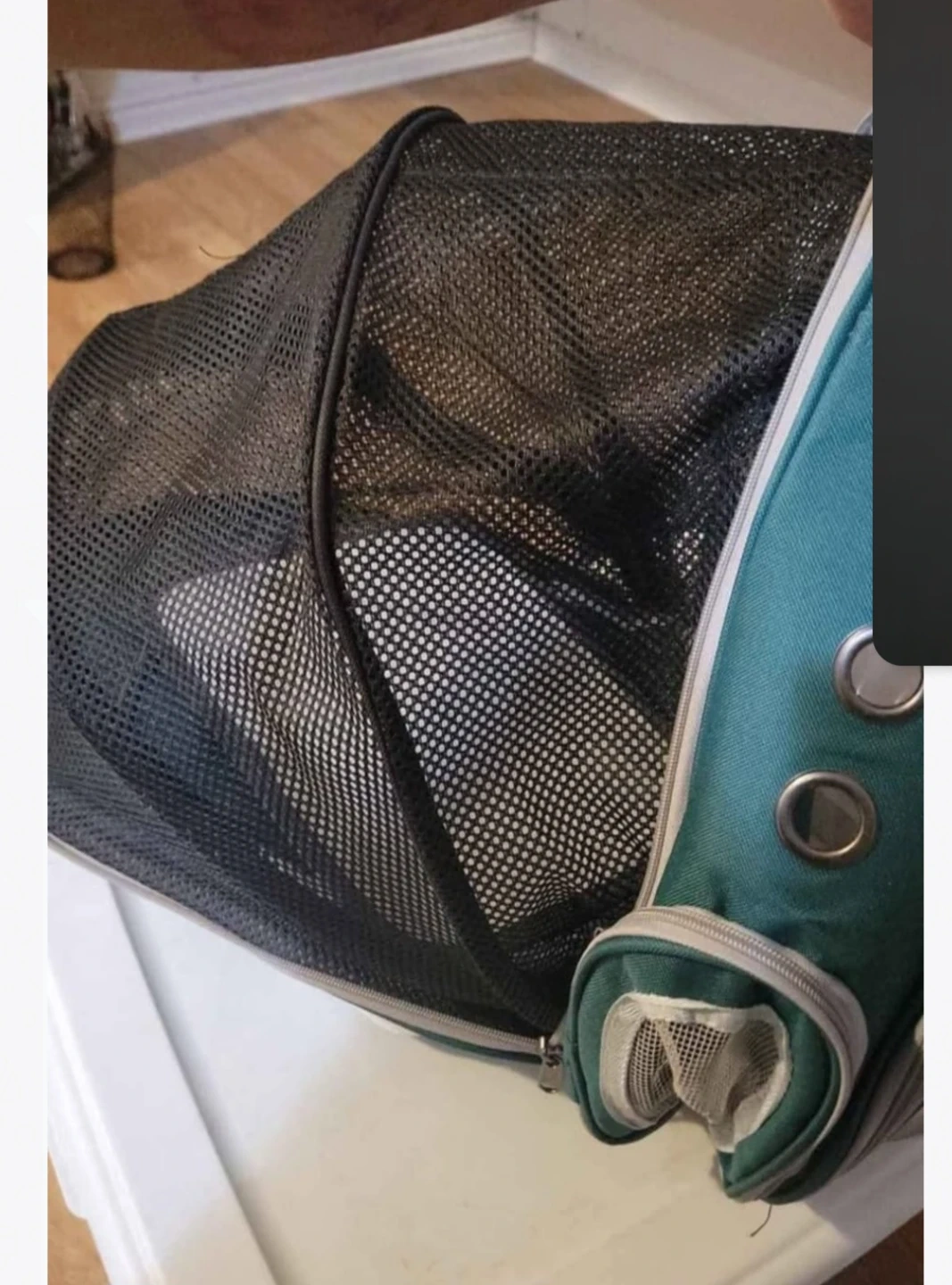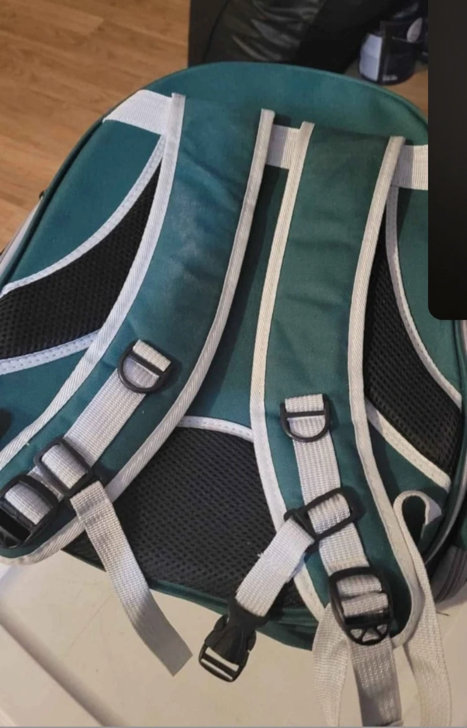 Selling a pet carrier backpack. It's green and looks like it is in good condition. Perfect for taking your furry friend on adventures!