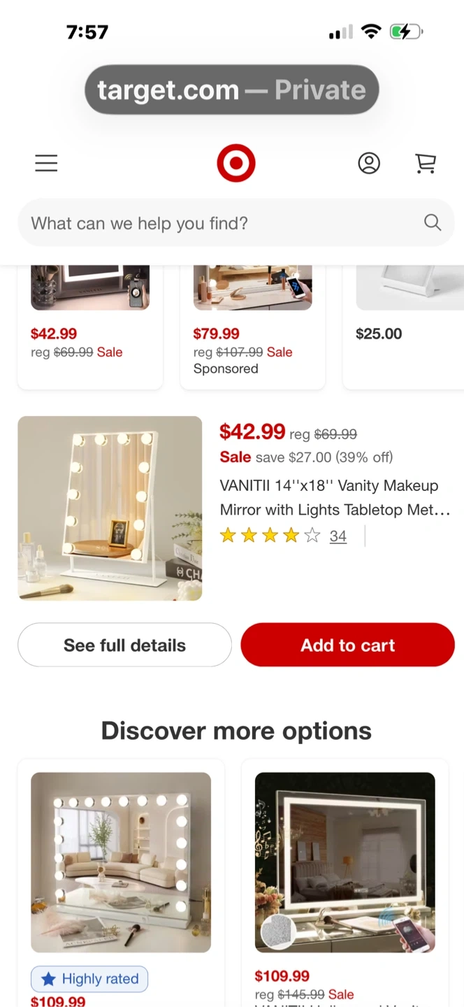 Selling a VANITII 14"x18" vanity makeup mirror with lights! It's a tabletop model with a metallic frame. Originally listed for $69.99, but on sale for $42.99. Great for getting ready!