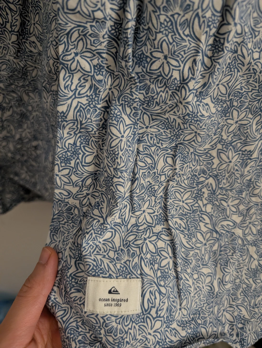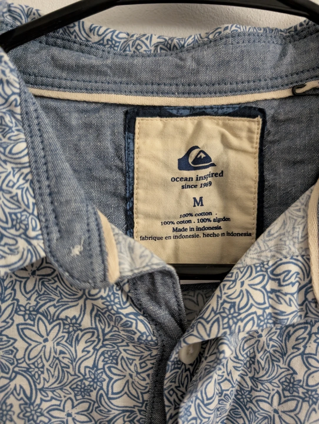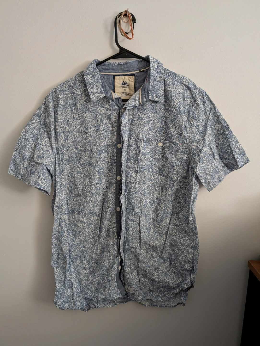 Selling a Quiksilver button-down shirt in size medium. It has a nice floral pattern and is made of 100% cotton. The shirt is in great condition!