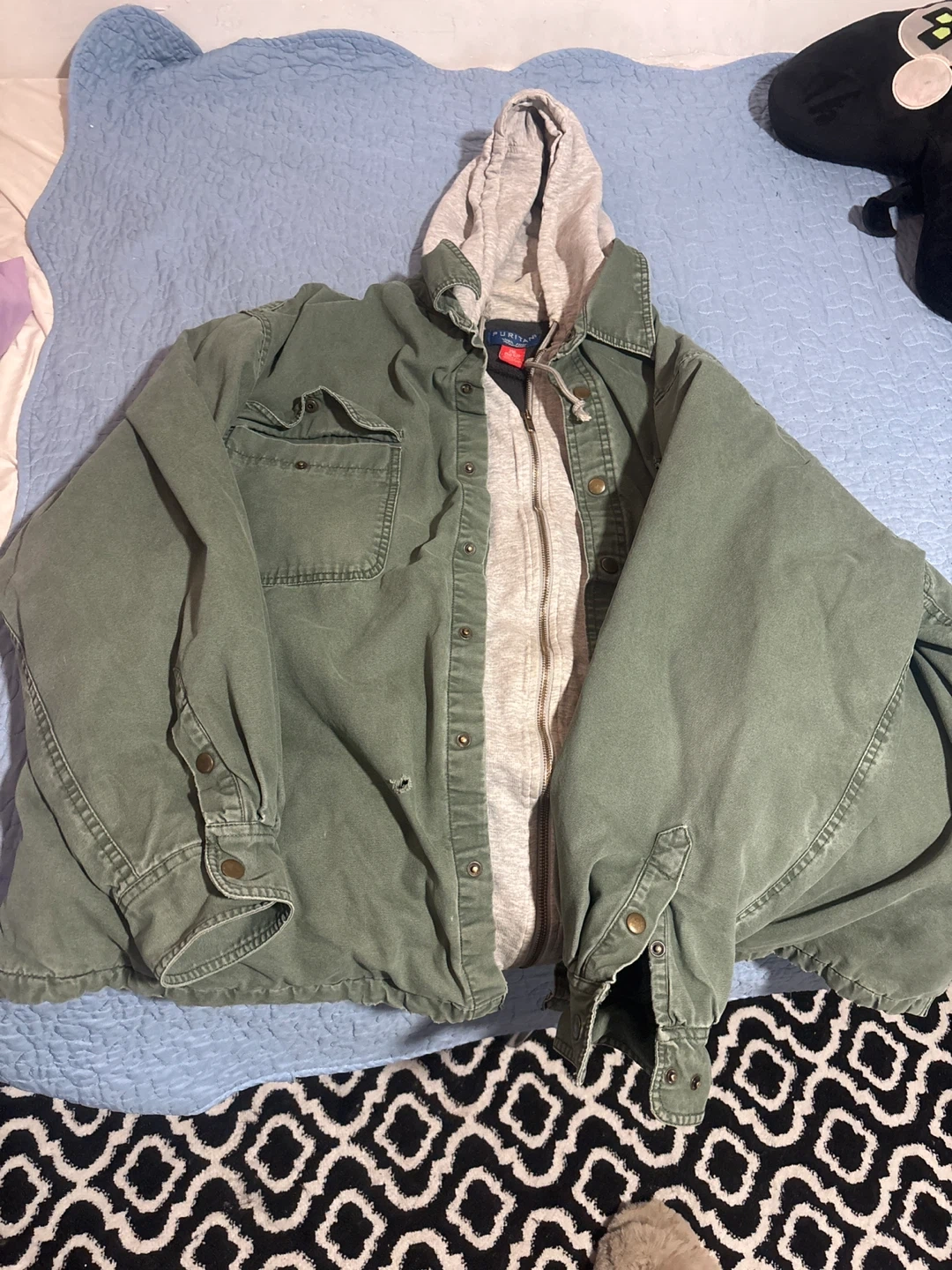 Selling a Puritan hooded jacket in size XXL. It's an olive green color and has a gray hood. The jacket shows some signs of wear.