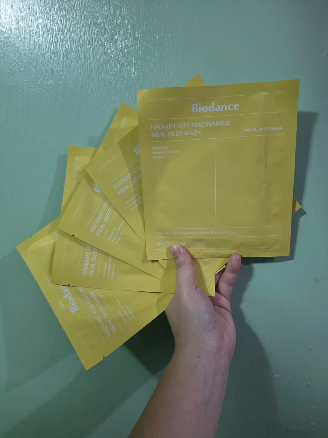 NEW Biodance Radiant Vita Niacinamide Real Deep Masks! These facial sheet masks contain niacinamide and pineapple fruit water. They help with dark spot care, improving dullness, and evening skin tone. Each mask has a net weight of 1.19 oz (34 g). Expires Oct/23/2027 (4 sheets) and Nov/28/2027 (1 sheet).