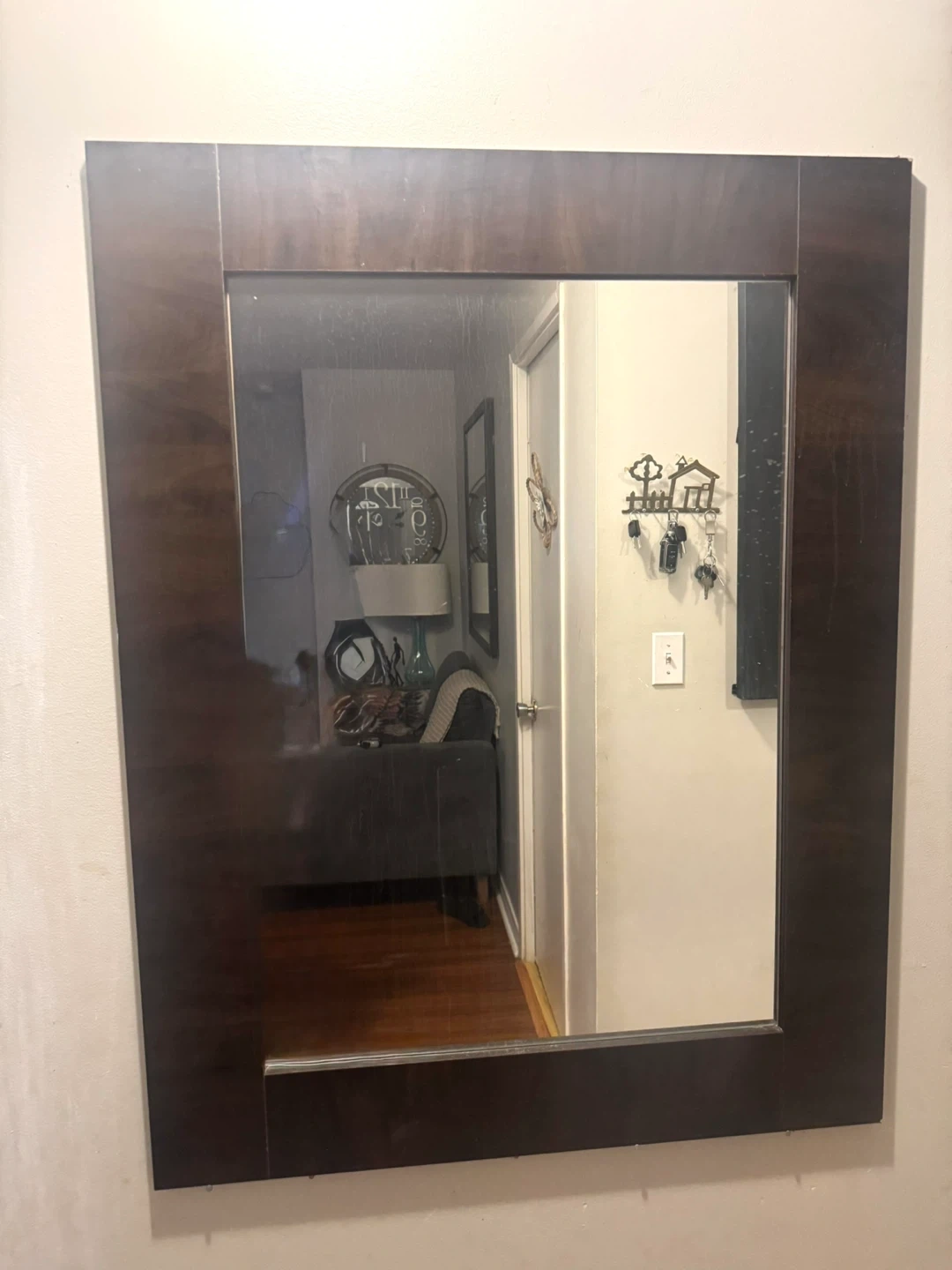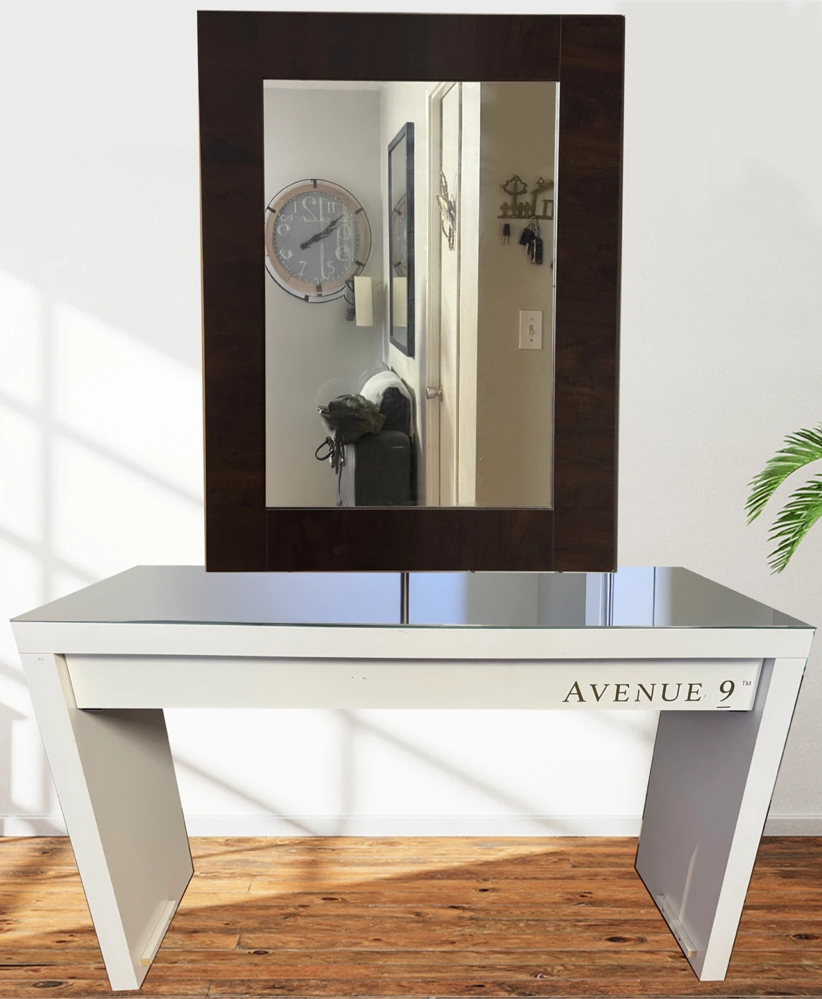 Selling an Avenue 9 vanity table with a big wall mirror. The table is white and features a sleek design with a big drawer space that opens. Perfect for a bedroom or dressing area. Mirror has two options rectangular brown large mirror or round white mirror.