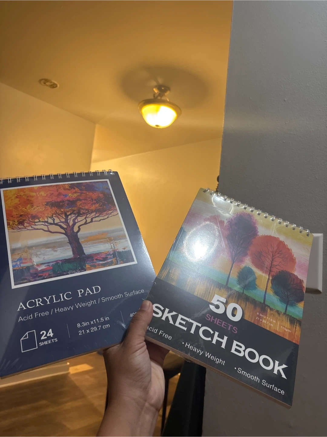 Selling an acrylic pad and sketch book set. The acrylic pad is acid-free, heavy weight with a smooth surface and contains 24 sheets. It measures 8.3in x 11.5 in (21 x 29.7 cm). The sketch book is also acid-free, heavy weight with a smooth surface and contains 50 sheets. It measures 8.3in x 11.5 in (21 x 29.7 cm) and is 110g/m²
