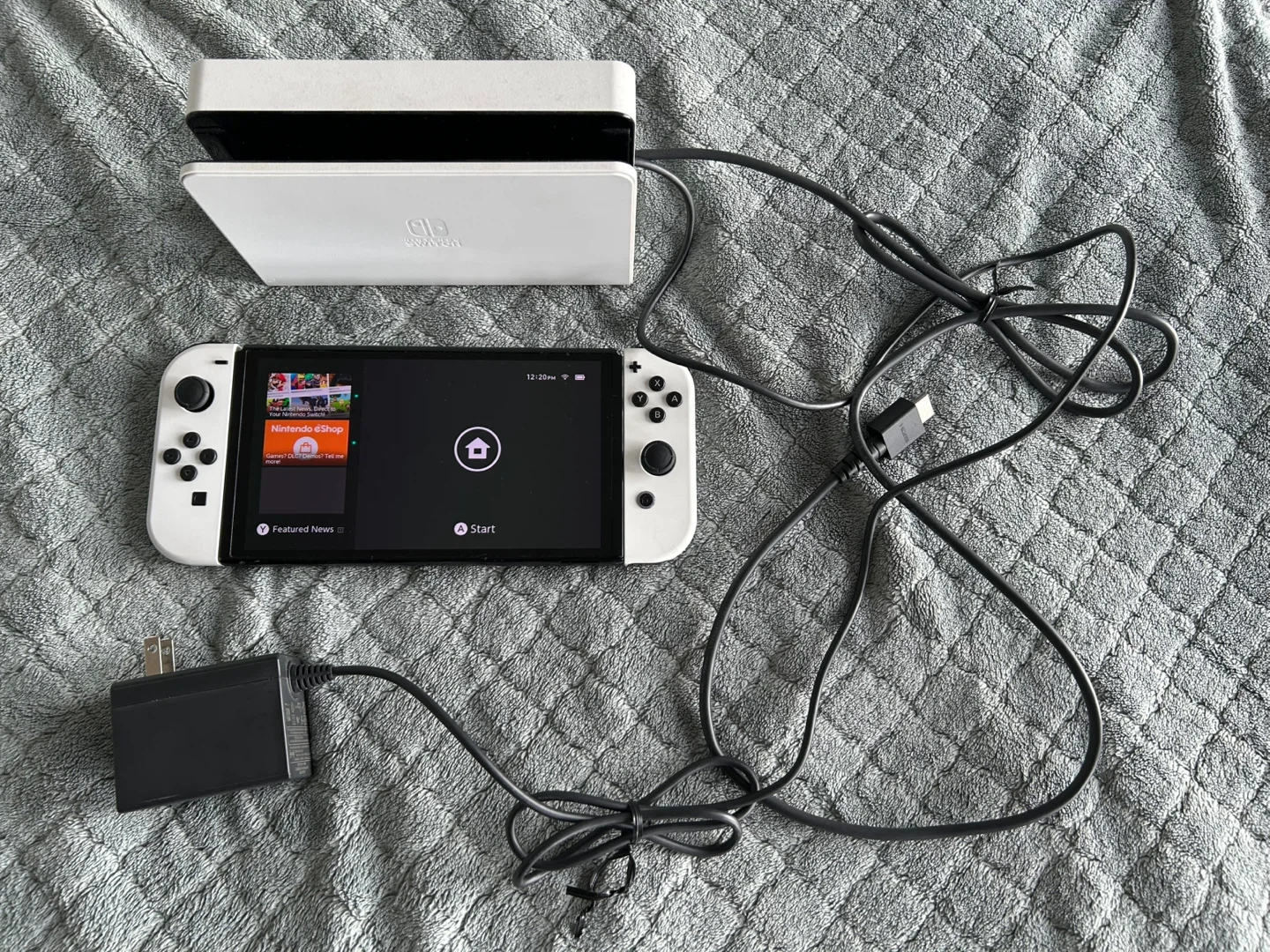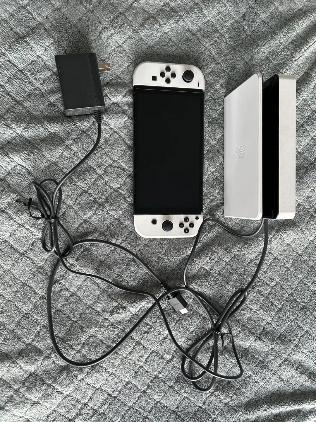 The switch works perfectly fine, has a few physical minor flaws/wear and tear. Comes with everything in the picture as well as the box + joy on straps