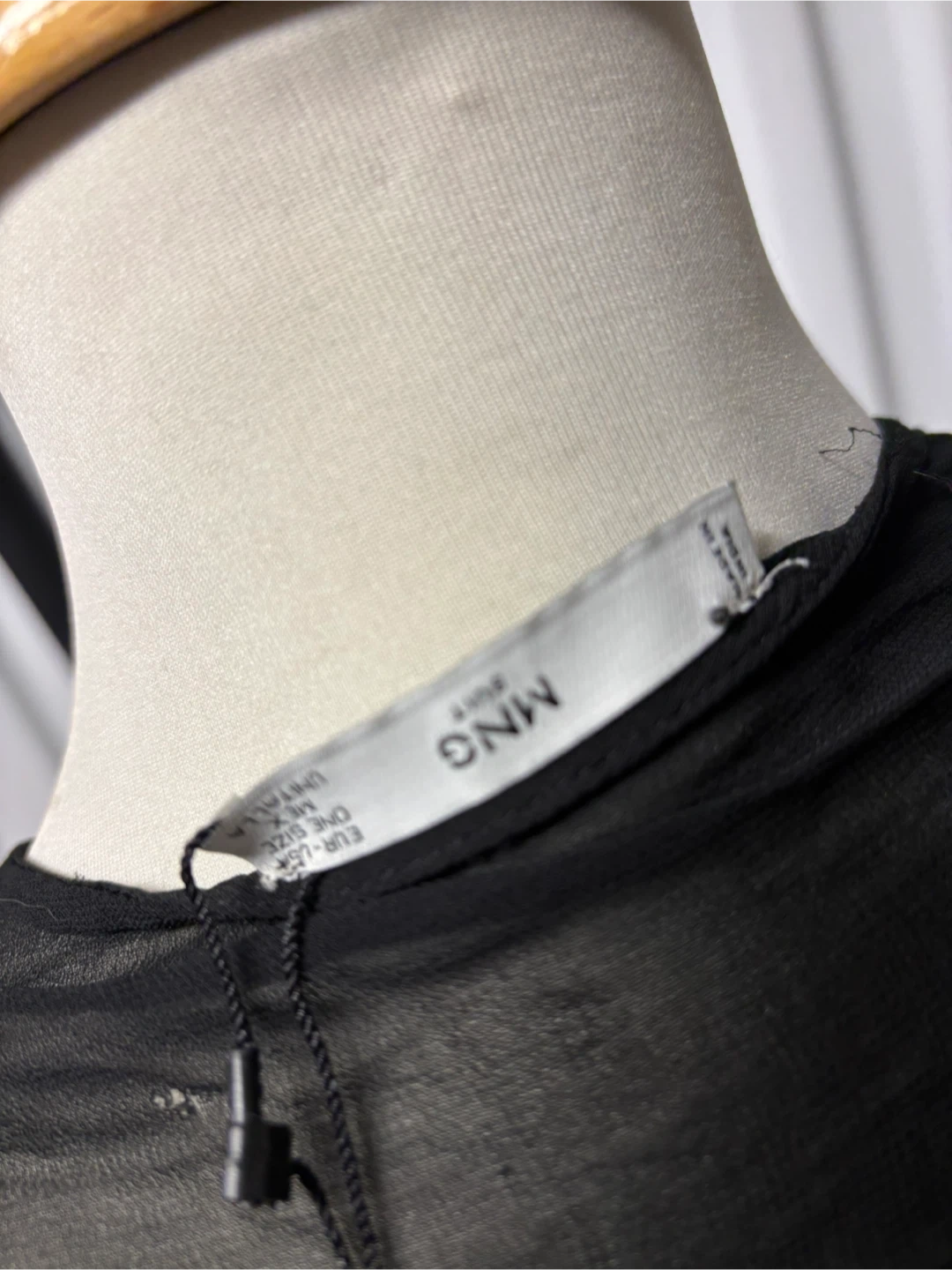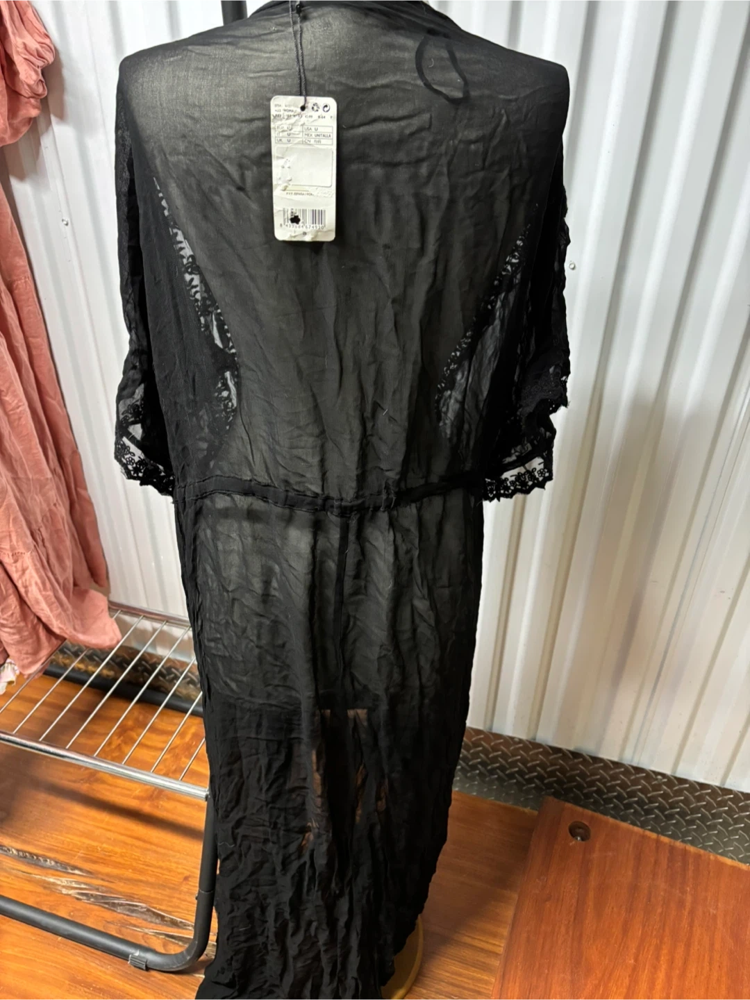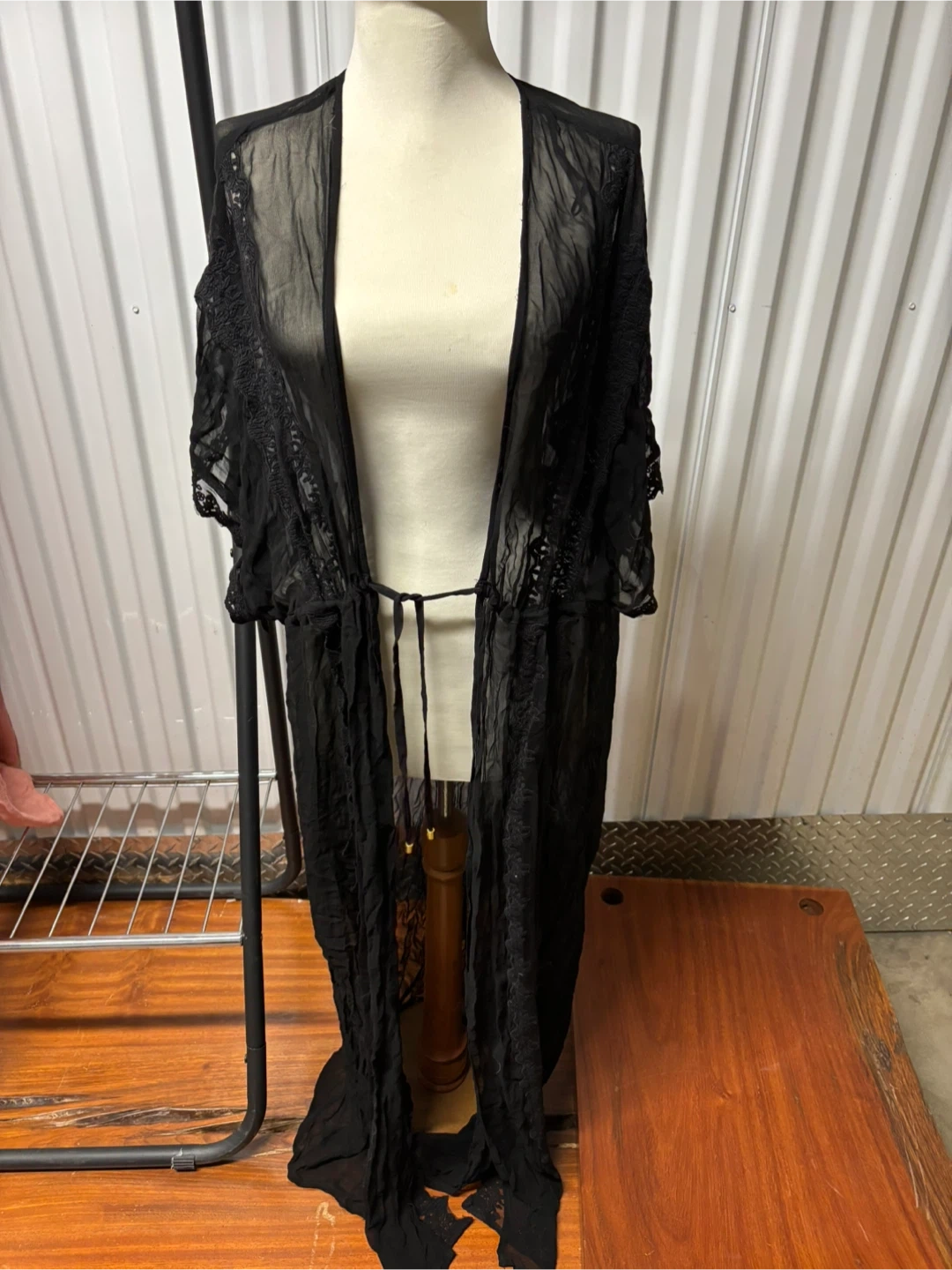Selling a beautiful black lace kimono from MNG! It's a one-size-fits-all, perfect for layering or as a beach cover-up. The delicate lace detailing adds a touch of elegance to any outfit