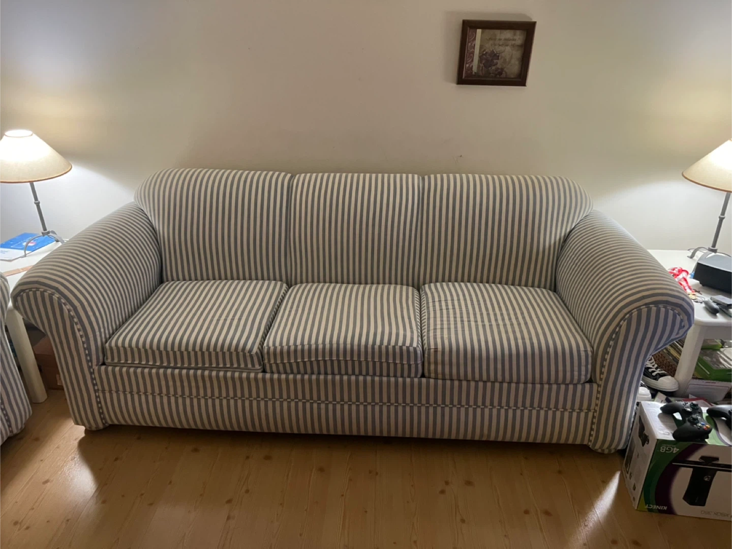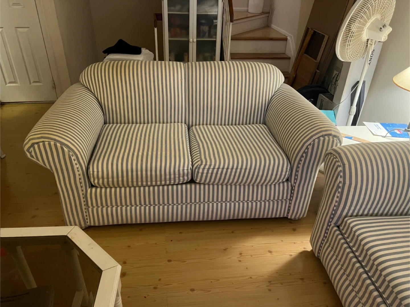 Selling a comfy sofa and loveseat set with a classic striped pattern. The set is in good condition and would be perfect for a living room or den. The material is durable and the cushions are supportive. Great for relaxing or entertaining guests! Sofa has a full size pullout bed.