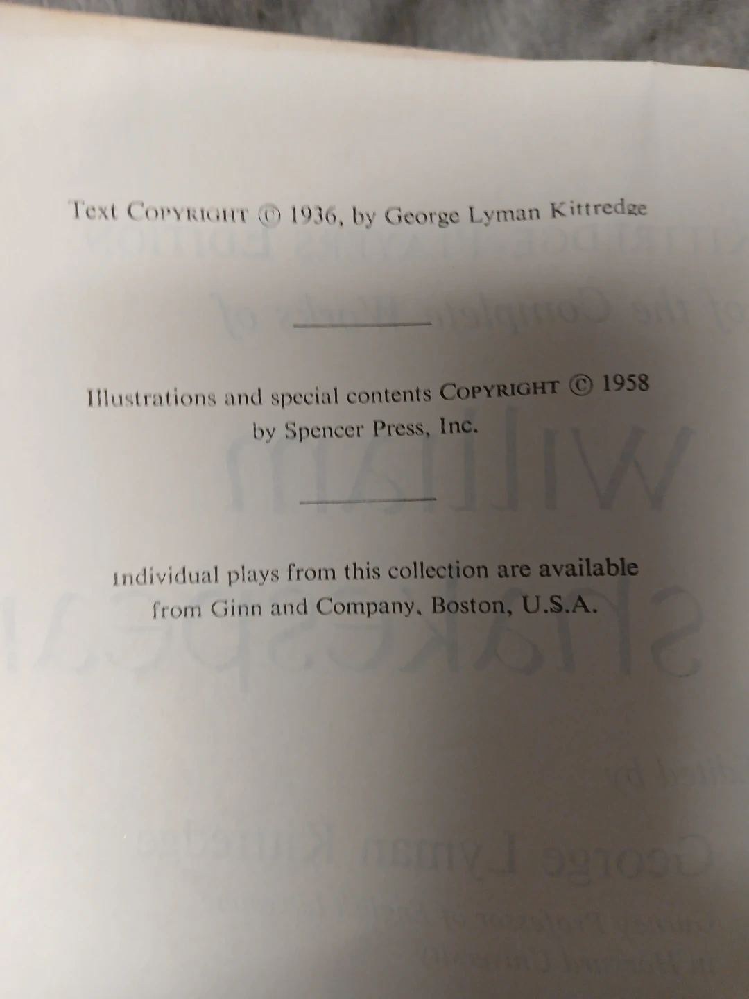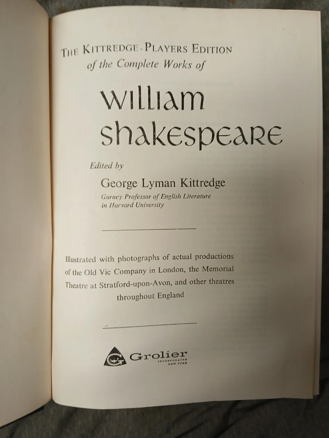 Selling The Complete Works of Shakespeare, Kittredge Edition. It is edited by George Lyman Kittredge. Text copyright is 1936, illustrations copyright 1958. This edition includes photographs of actual productions of the Old Vic Company in London.