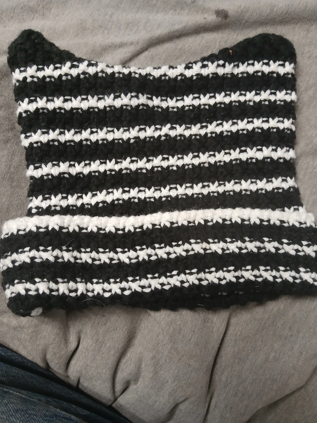 Selling a Charles Jeffrey Loverboy chunky knit beanie! It features a black and white striped design with cute little cat ears. It's in great condition and ready to keep you warm and stylish