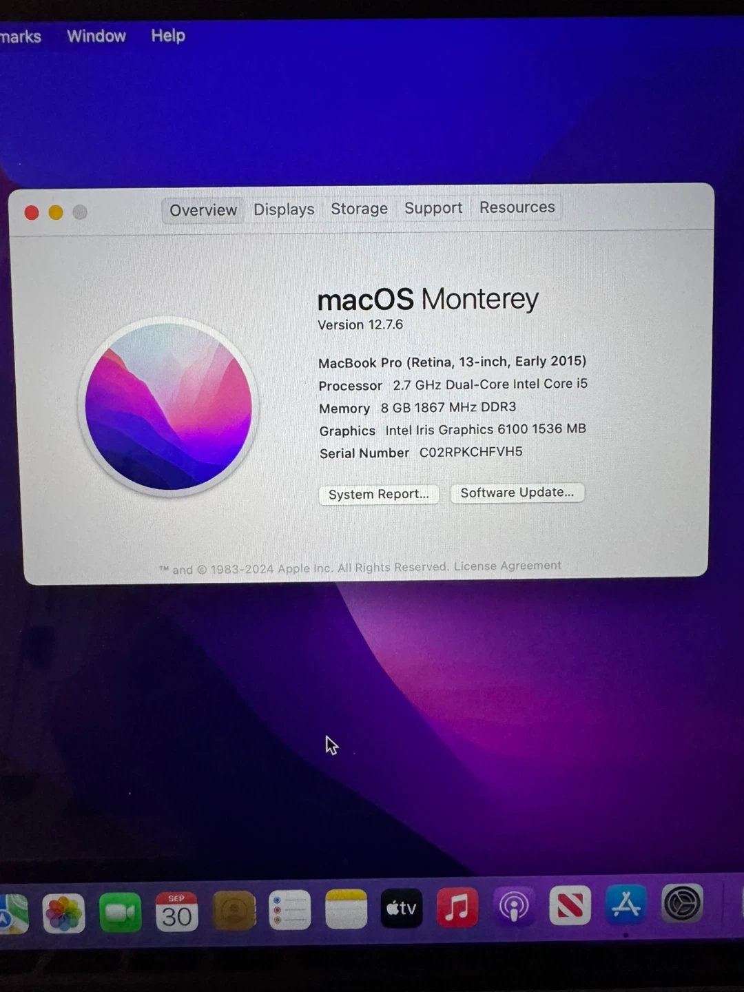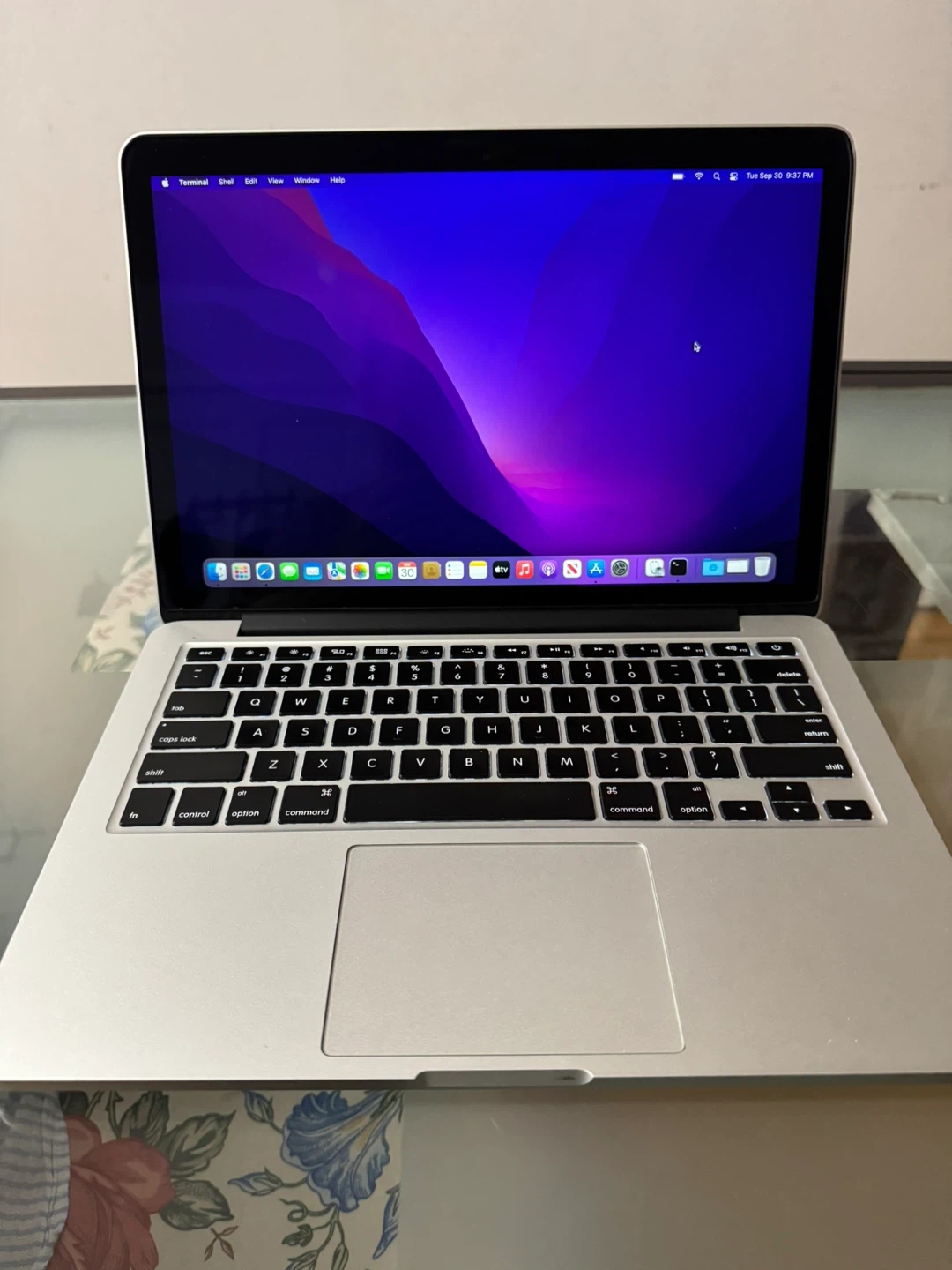 Selling a MacBook Pro (Retina, 13-inch, Early 2015) in good condition. It has macOS Monterey Version 12.7.6. Specs: - Processor: 2.7 GHz Dual-Core Intel Core i5 - Memory: 8 GB 1867 MHz DDR3 - Graphics: Intel Iris Graphics 6100 1536 MB - Storage: 512 GB Flash Storage