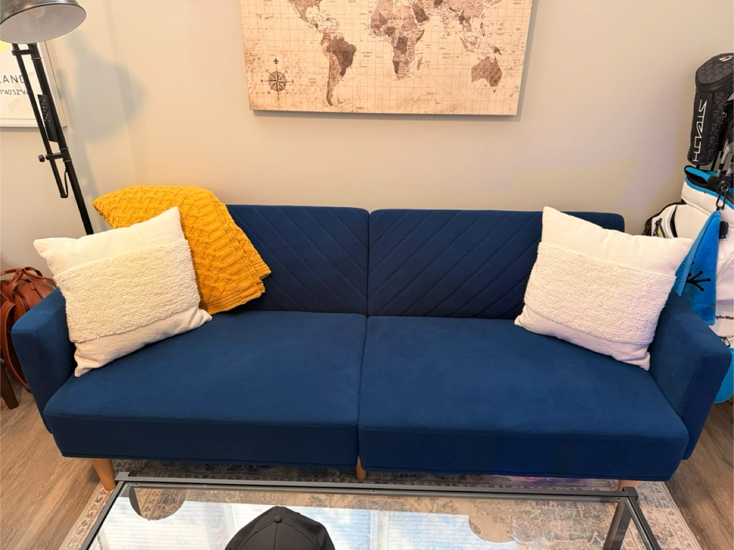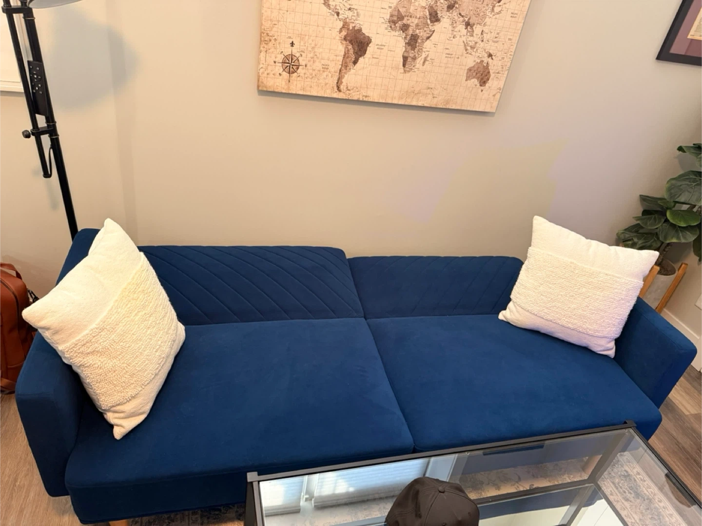 Selling a stylish blue velvet sofa that's in great condition! It's a modern design that will look great in any living room. The velvet material is soft and comfortable, perfect for lounging. It's a great piece to add a pop of color to your home!