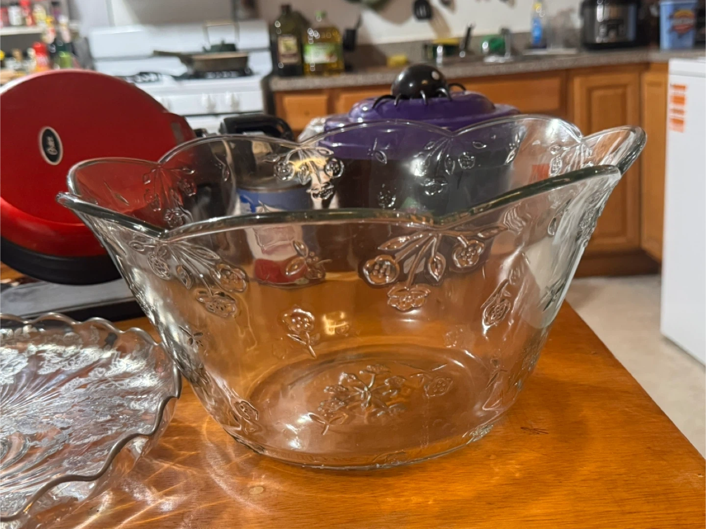 Selling a beautiful clear glass bowl and plate set. Both pieces feature a lovely floral embossed design. Perfect for serving or displaying your favorite treats!